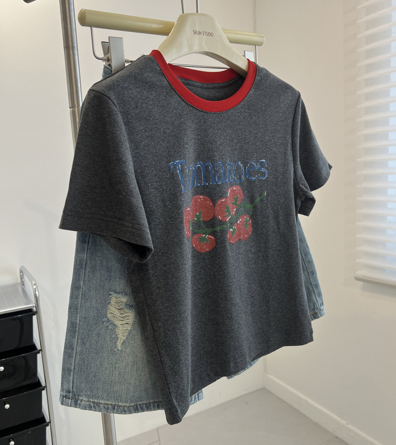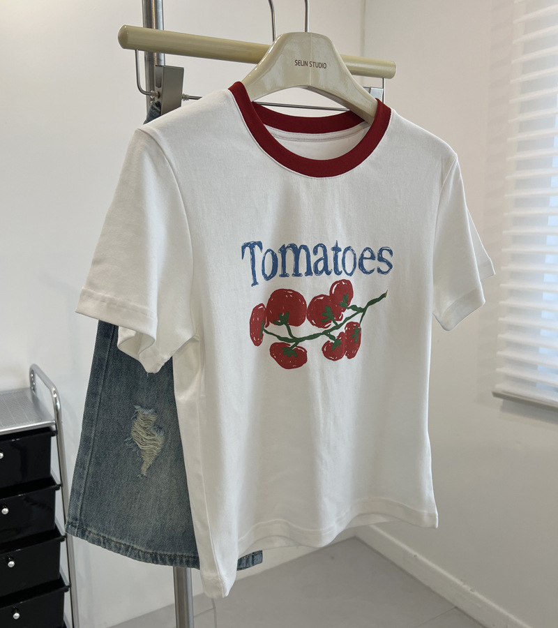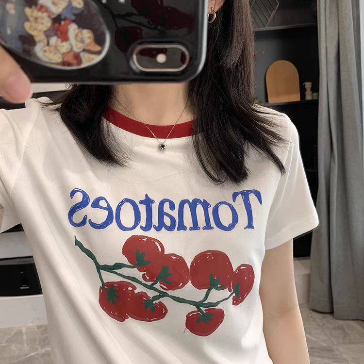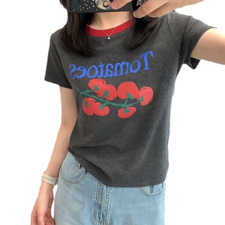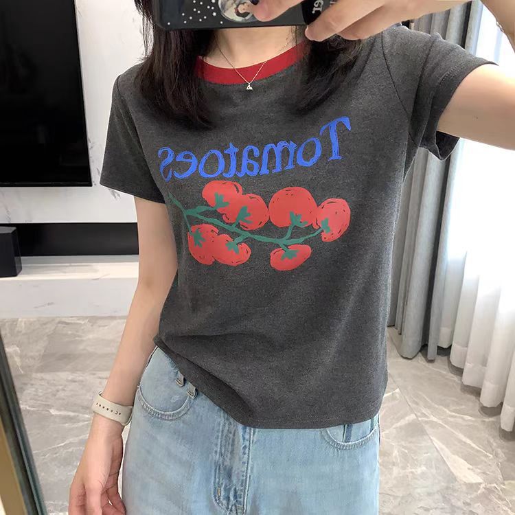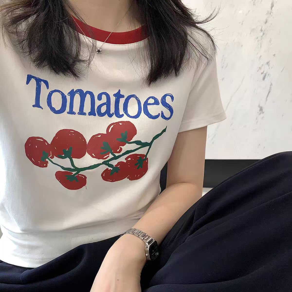 韩版减龄撞色番茄印花圆领短袖t恤女修身短款内搭打底衫上衣夏季
