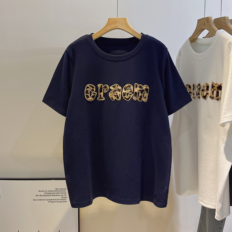 磨毛豹纹字母刺绣短袖T恤女韩国爆款时尚基础款圆领打底上衣