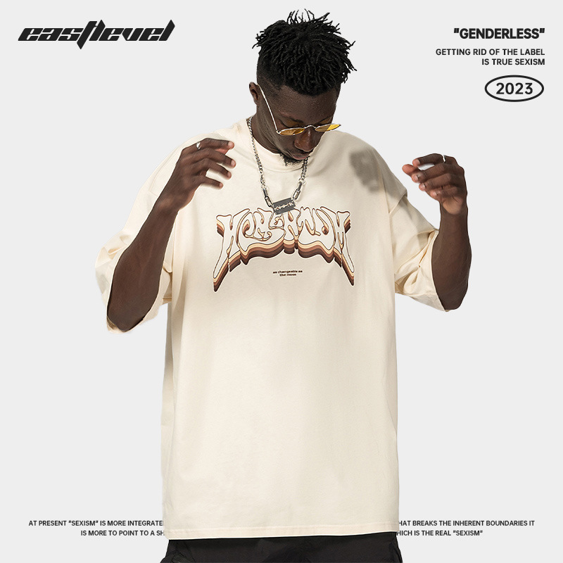 纯棉美式街头彩色字母涂鸦趣味宽松百搭时尚个性圆领休闲短袖上衣