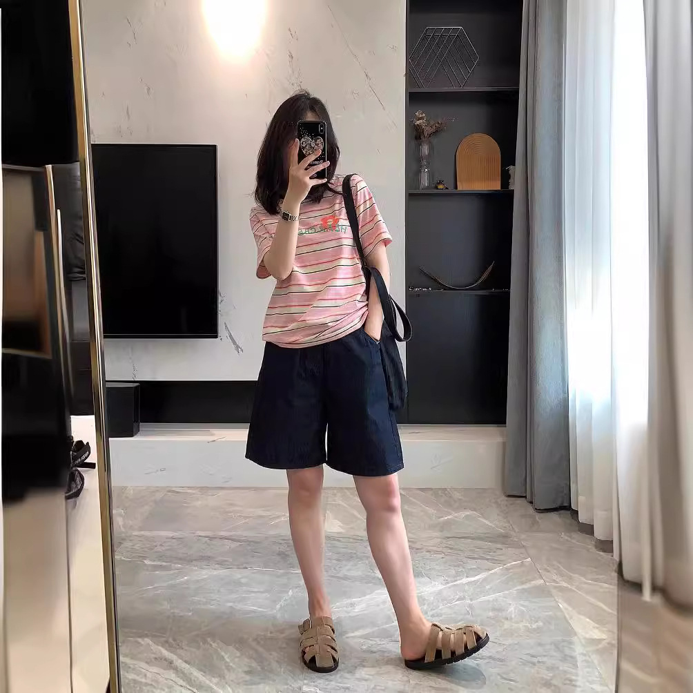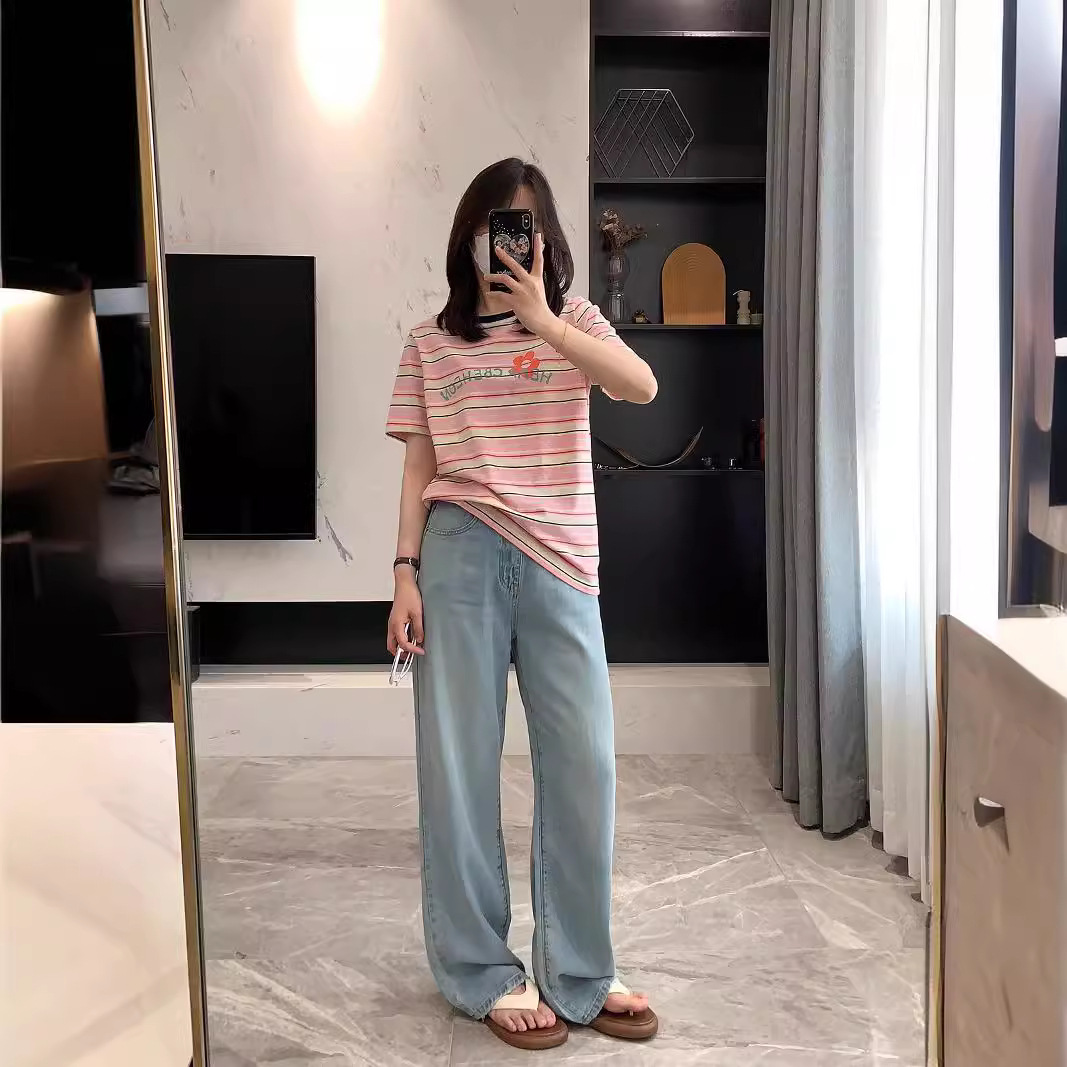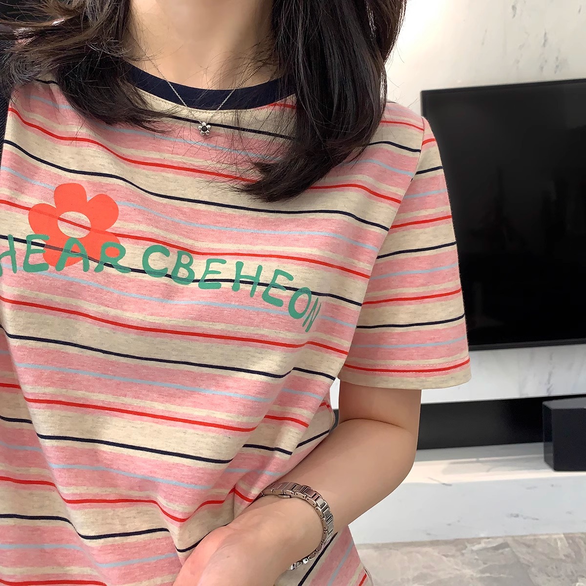花朵印花条纹粉色T恤撞色领夏季彩棉宽松百搭多巴胺短袖