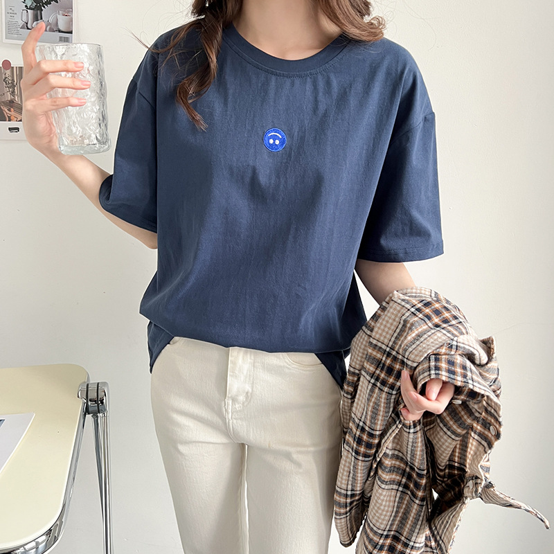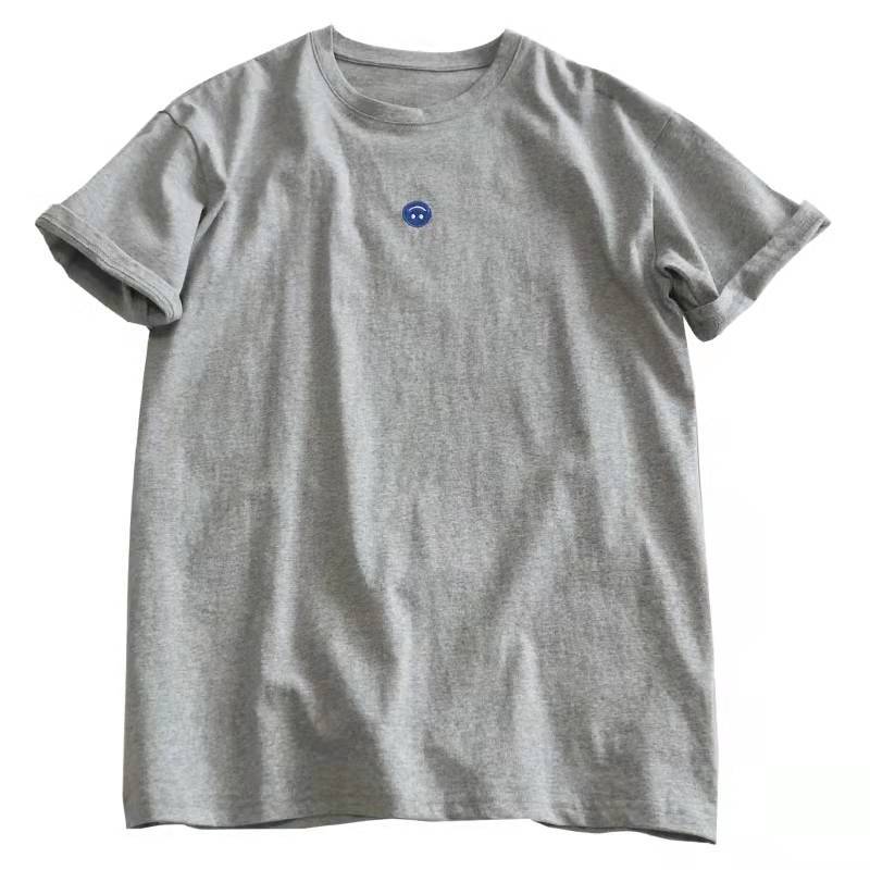 刺绣笑脸半袖上衣春秋加厚打底衫宽松韩版磨毛短袖t恤女纯棉