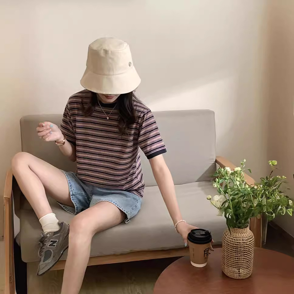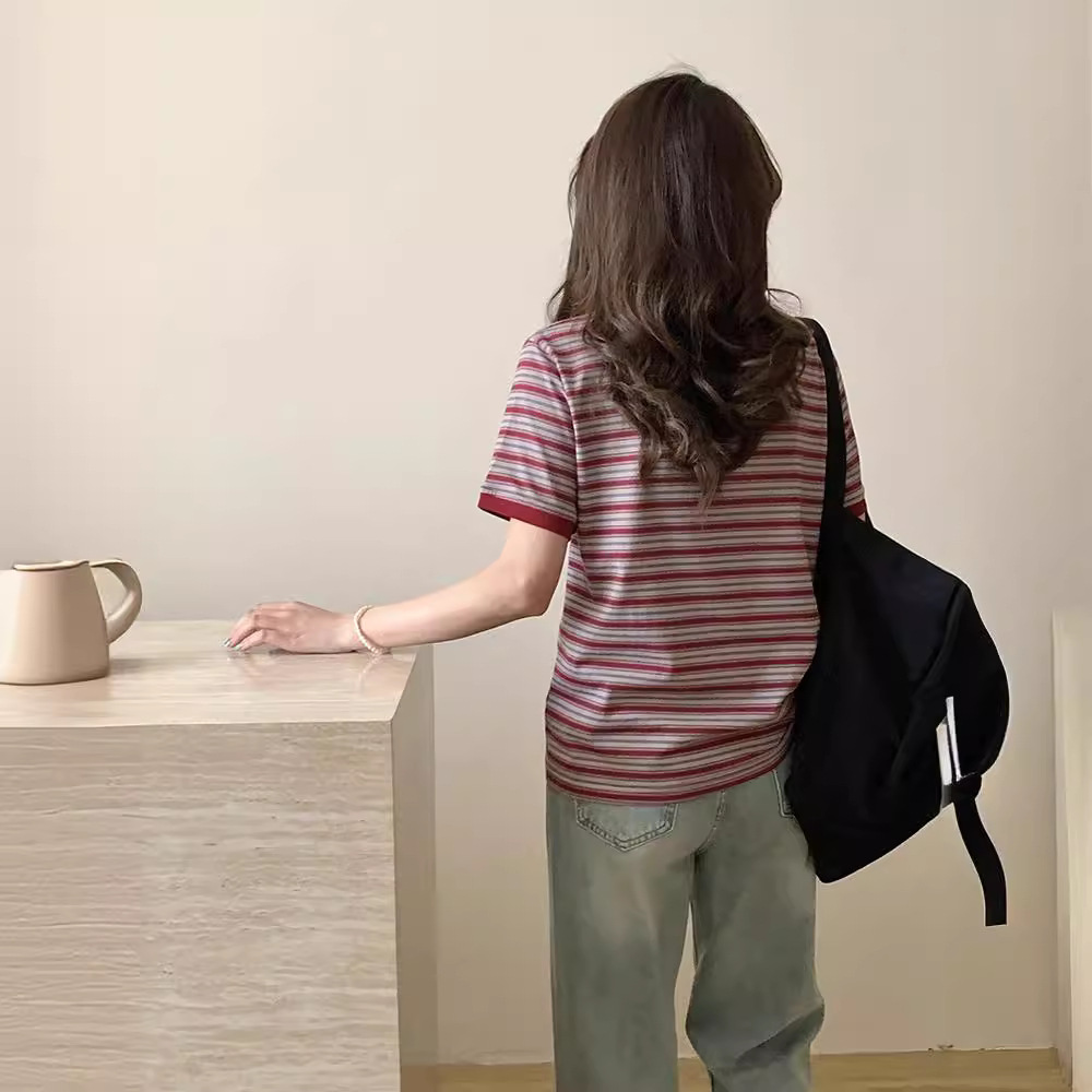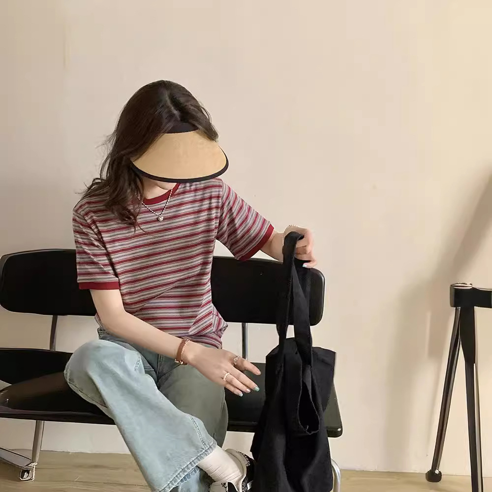 港味复古撞色条纹chic纯棉t恤女夏季宽松小众圆领打底短袖上衣潮