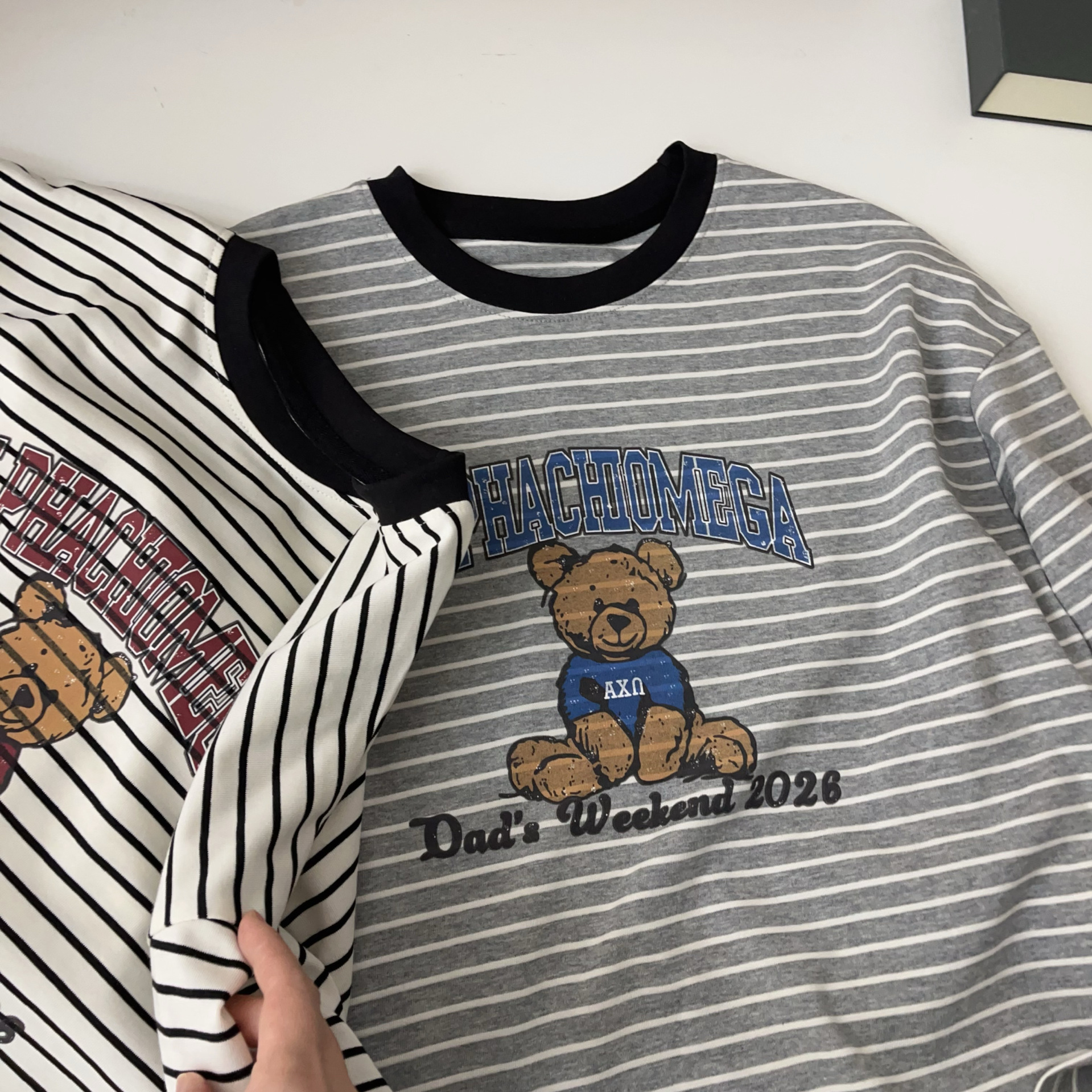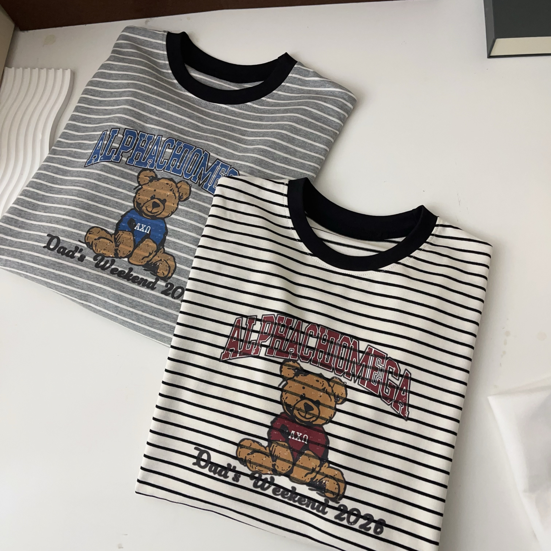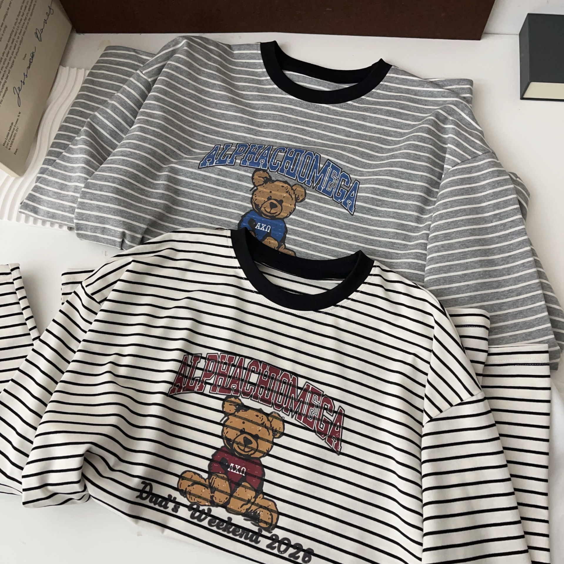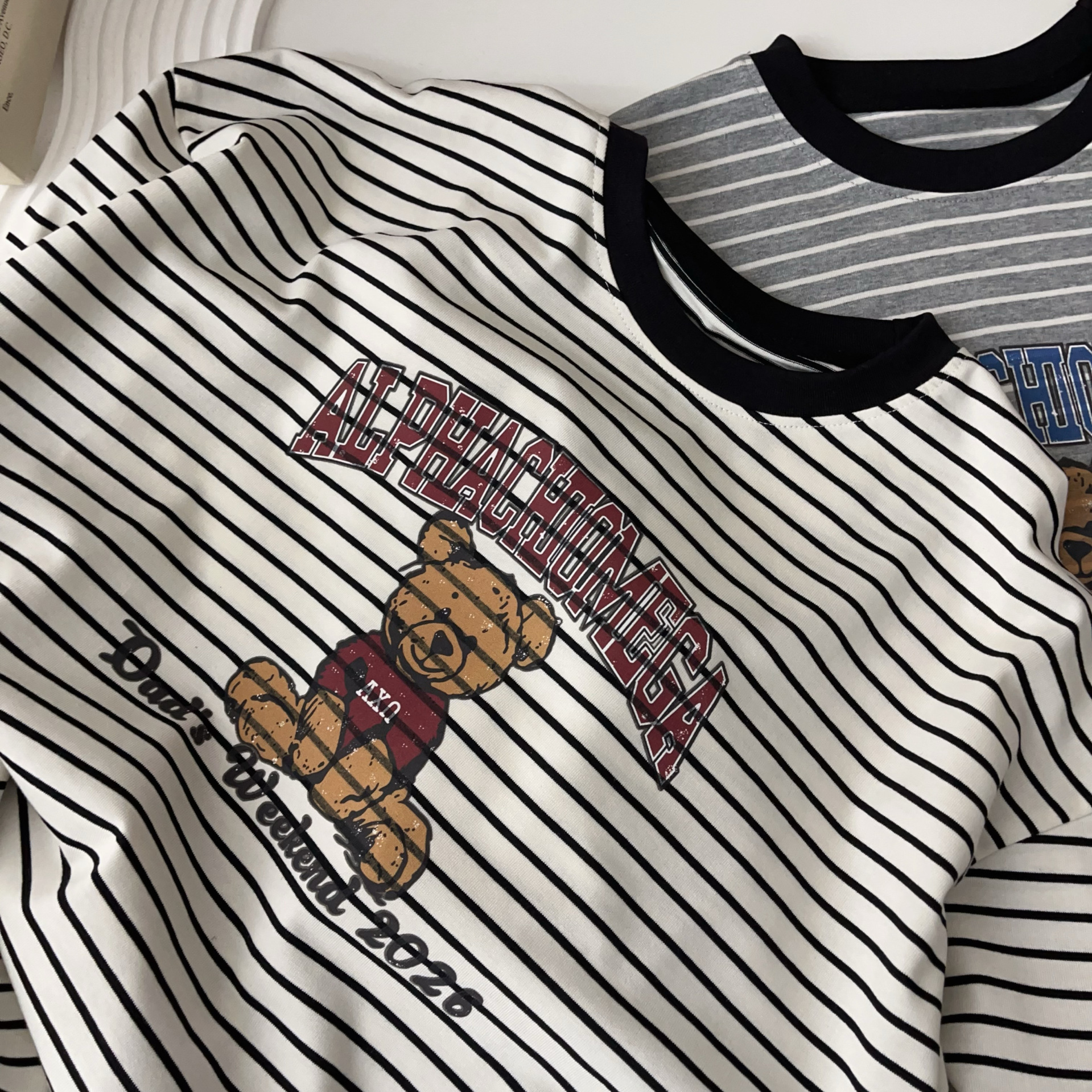 条纹打底衫年春秋新款圆领印花字母小熊长袖磨毛T恤女上衣服