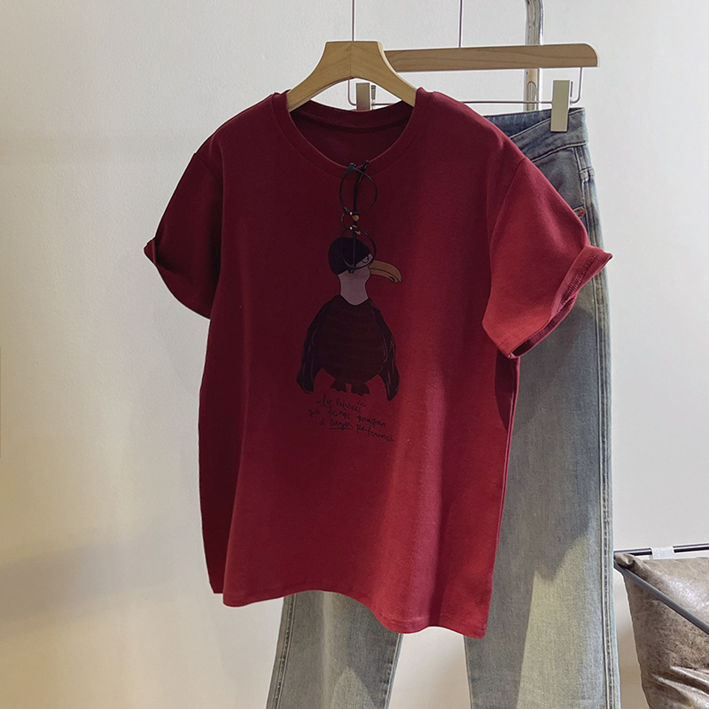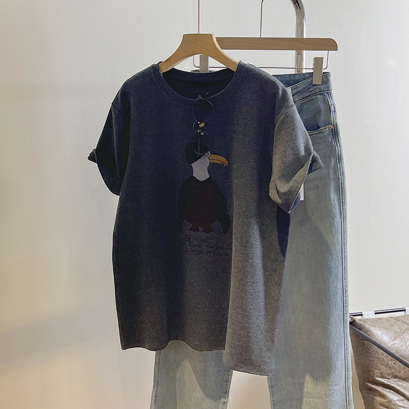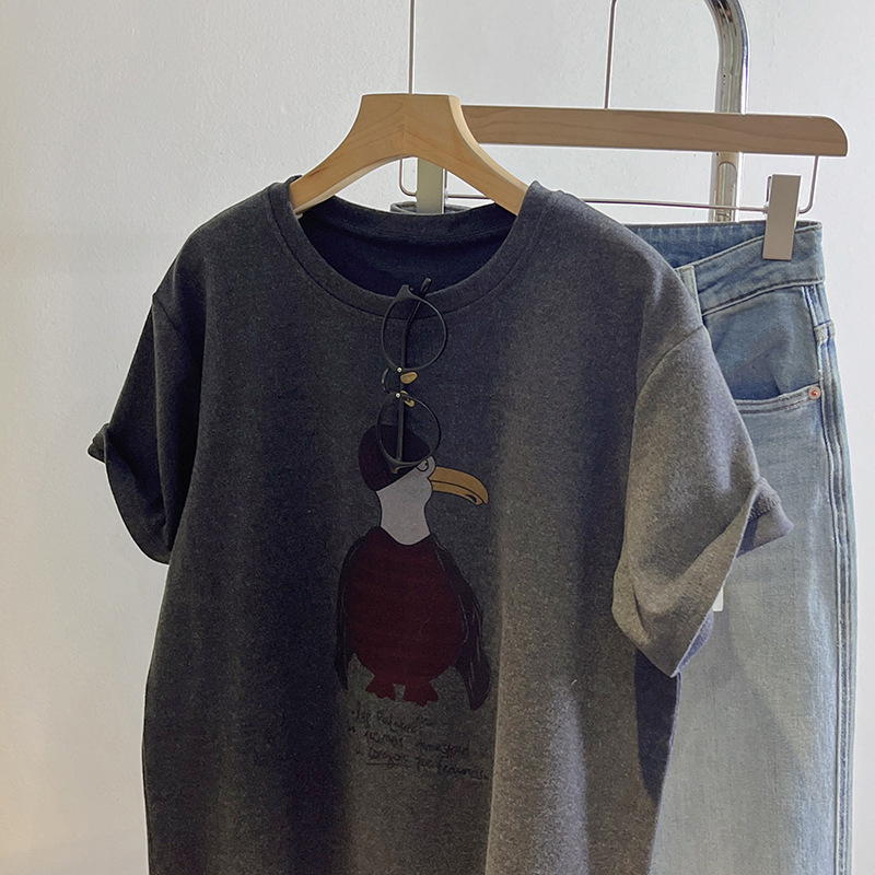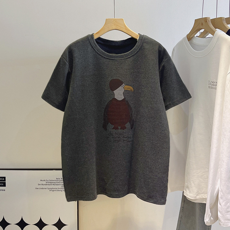 春装新品磨毛鸭子卡通印花短袖T恤女潮韩版复古宽松内搭半袖上衣