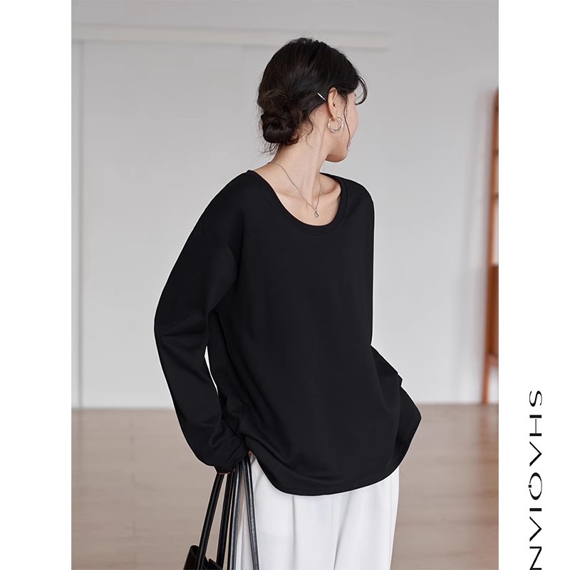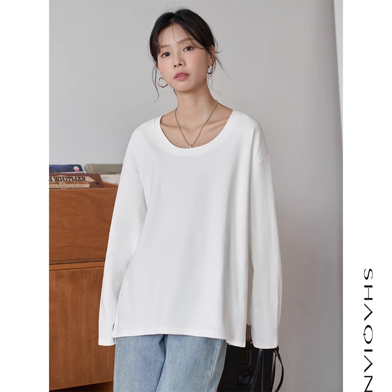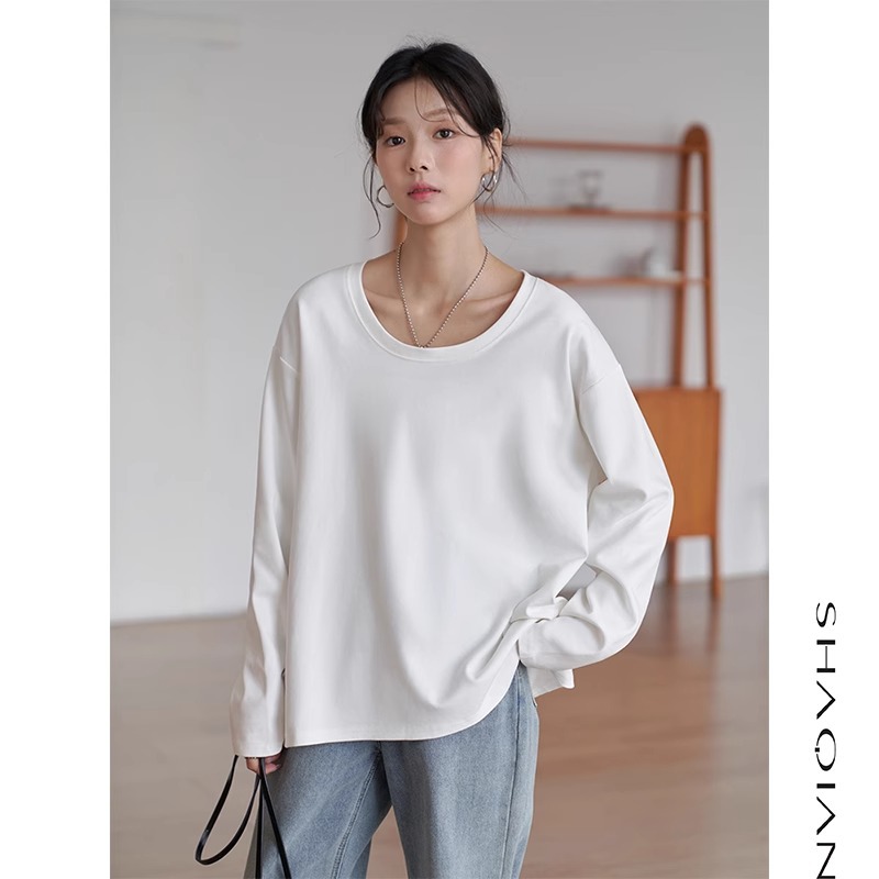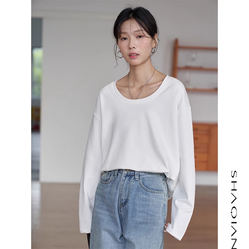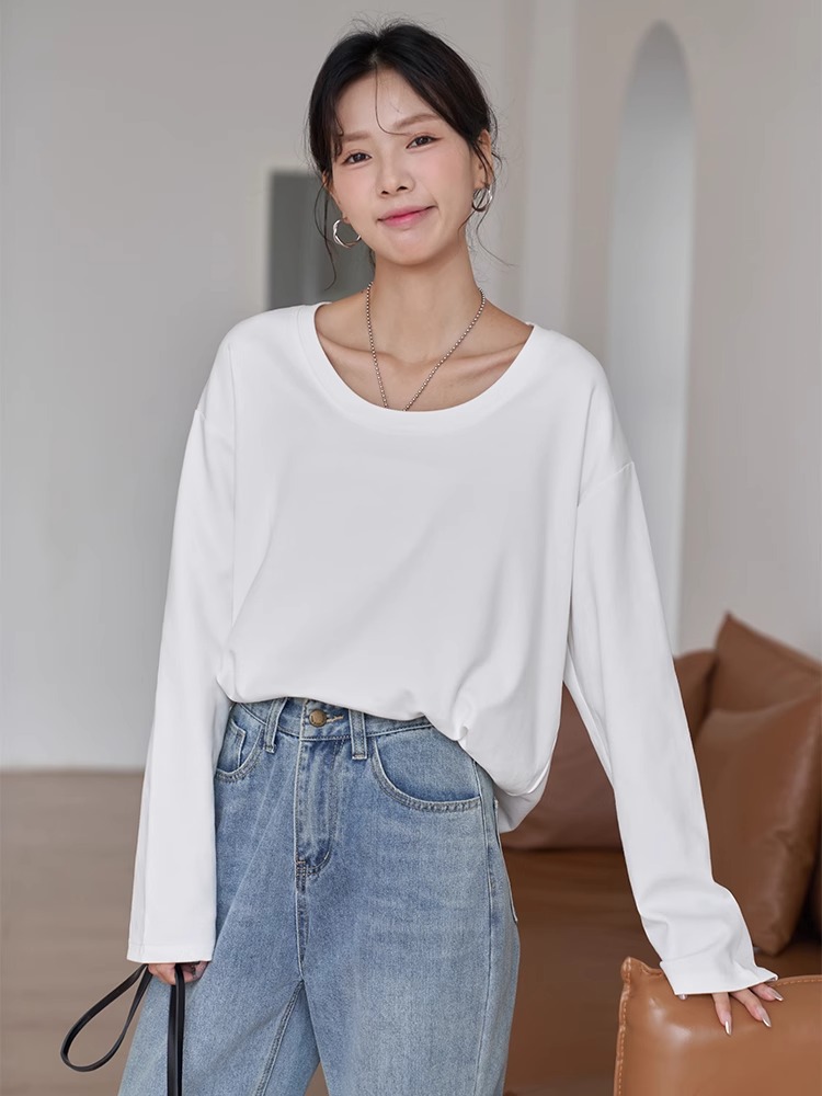 大领口纯棉白色t恤女长袖秋季新款宽松纯色U领低领内搭打底衫