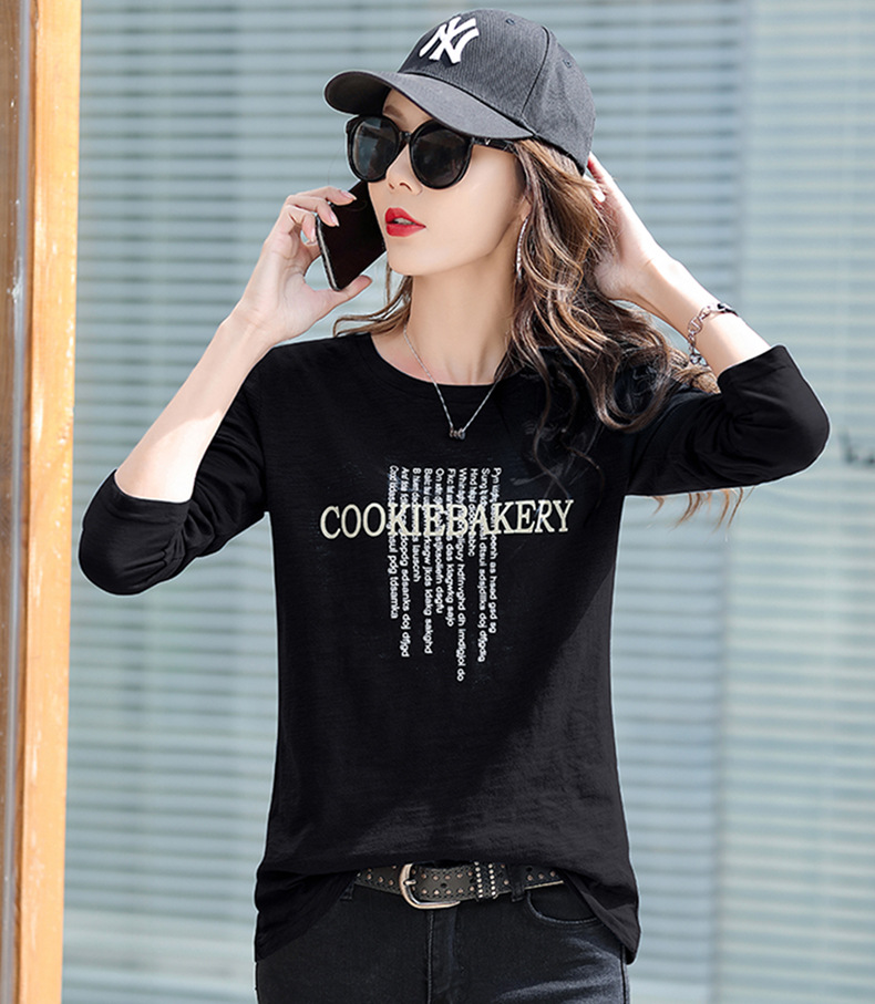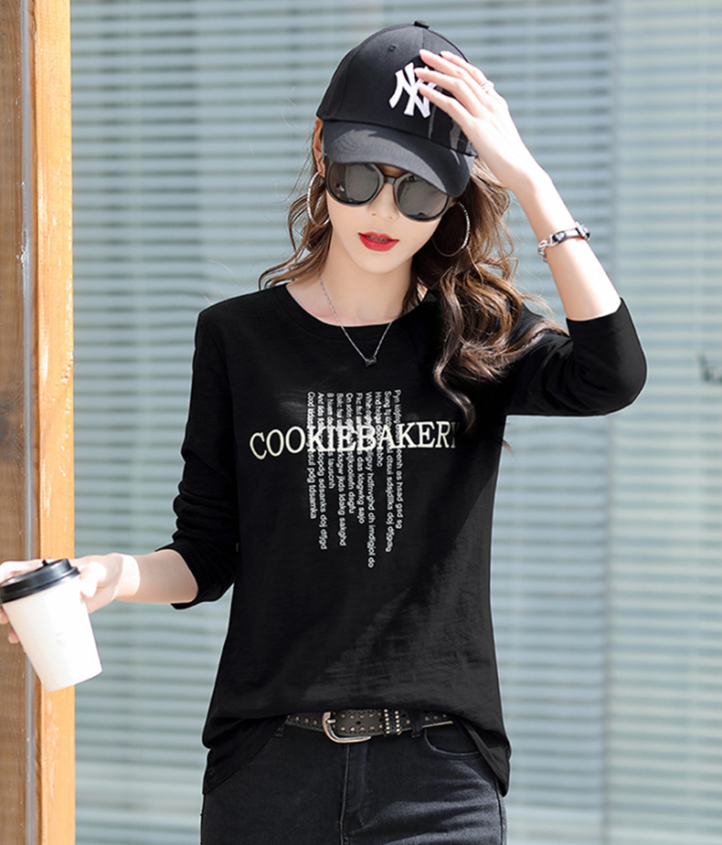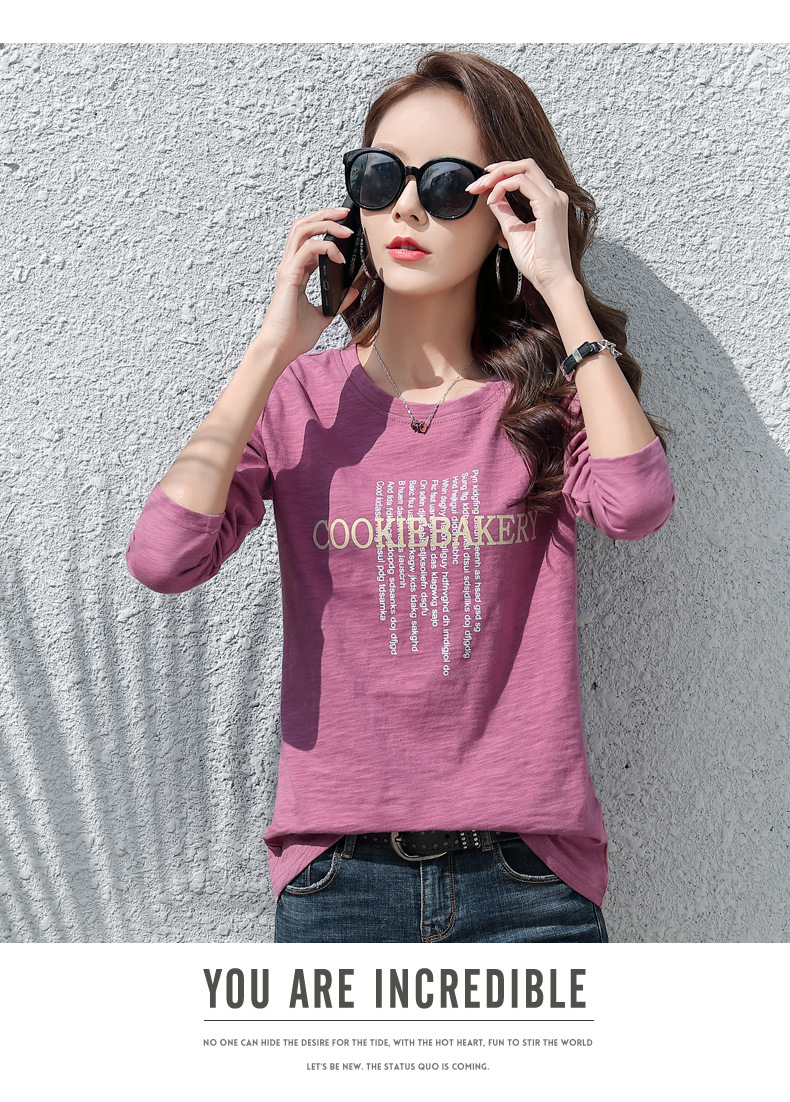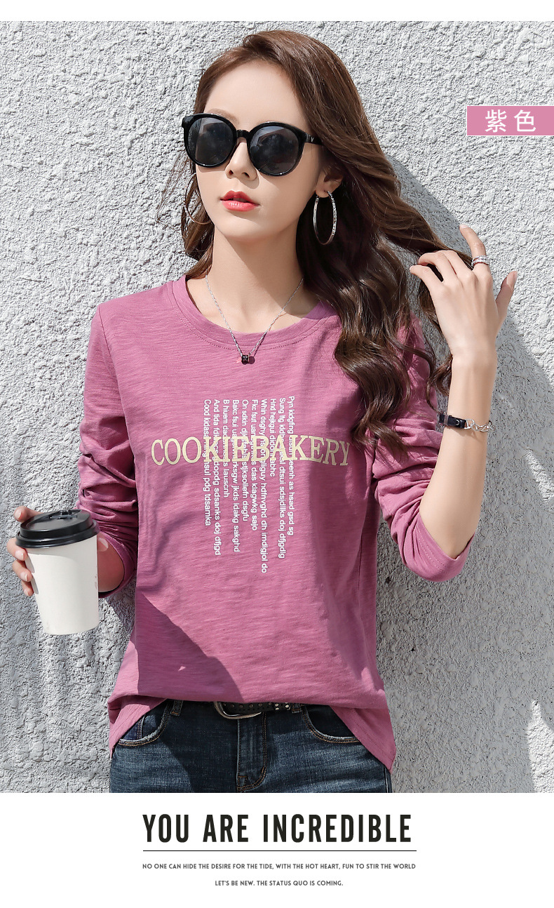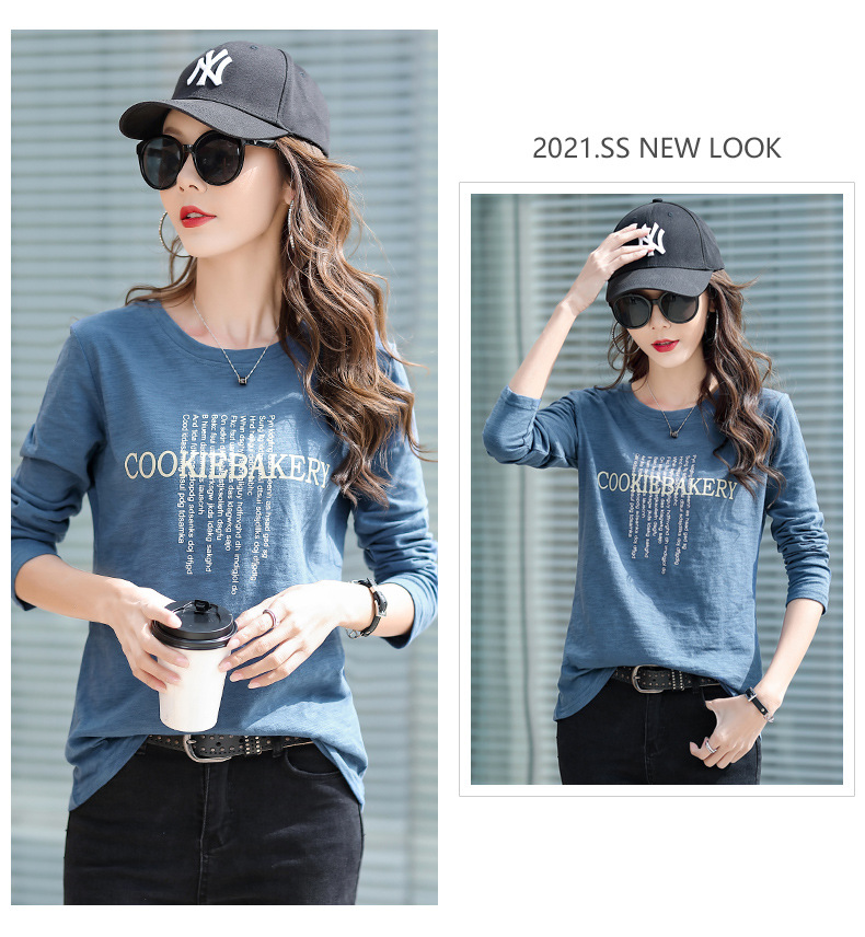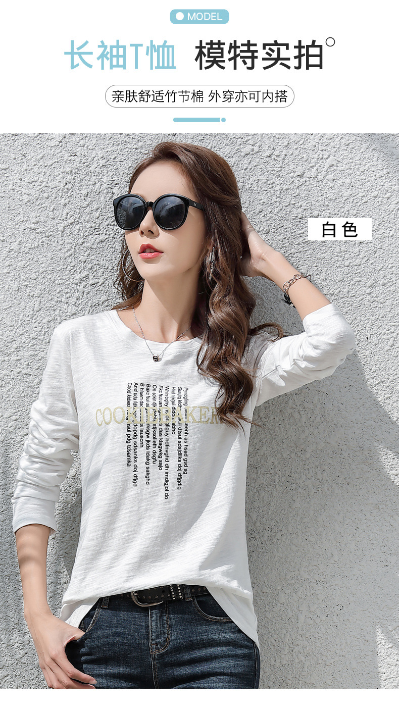 春季新款纯棉长袖T恤女竹节棉印花圆领上衣宽松显瘦网红小衫