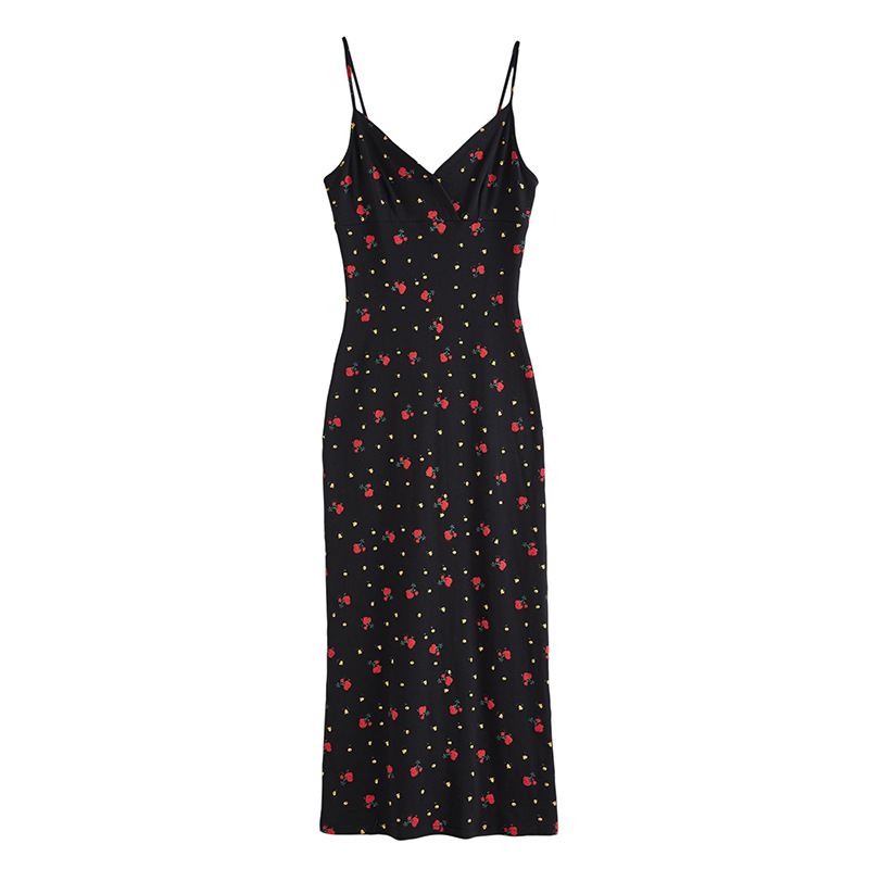 #260g精梳纯棉#玫瑰印花V领吊带连衣裙女夏2025新款开衩性感长裙