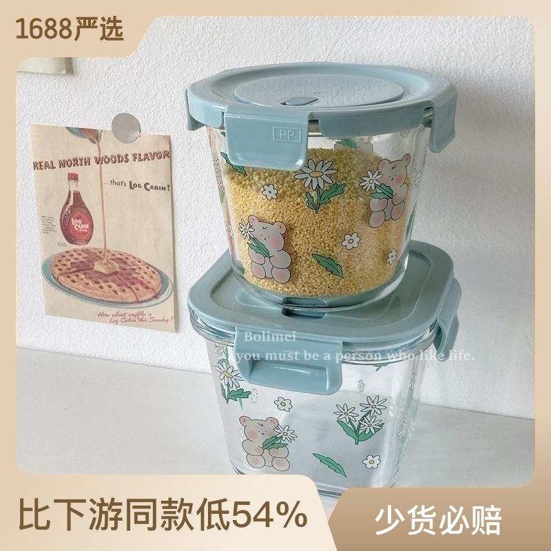博立美 雏菊小熊保鲜碗耐热玻璃保鲜盒带盖汤碗便携玻璃碗