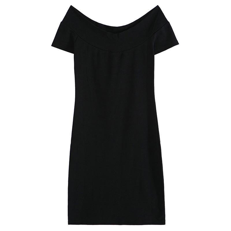 230g纯棉一字肩短袖连衣裙女气质优雅小黑裙包臀短裙纯色2025夏季