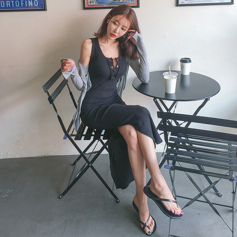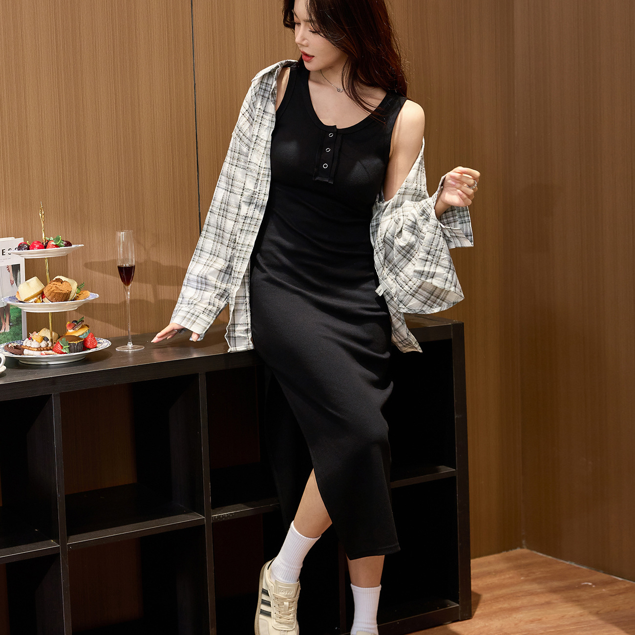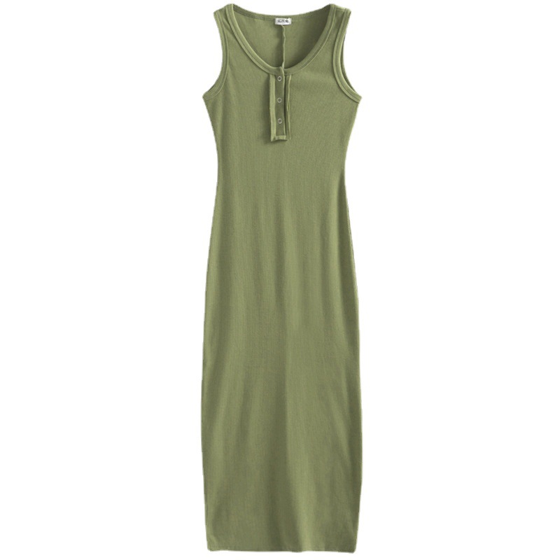 背心连衣裙2025夏季吊带长裙无袖纯色优棉收腰显瘦紧身气质纽扣裙