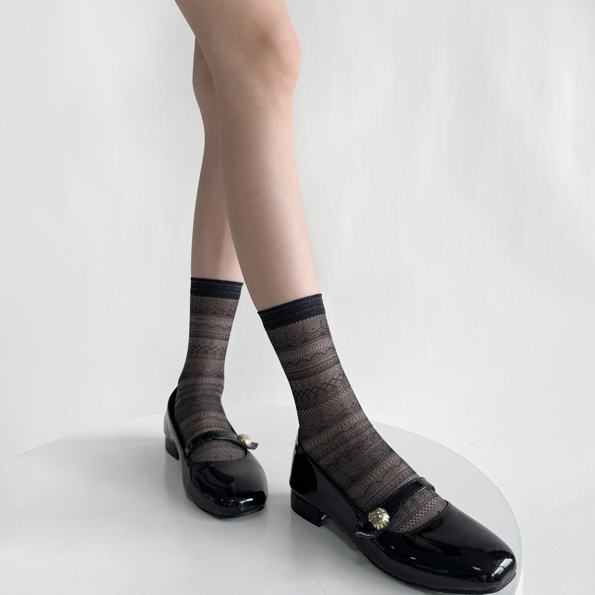 春夏季超薄透肉中筒袜子奶白色简约百搭网眼日系花纹黑色堆堆短袜