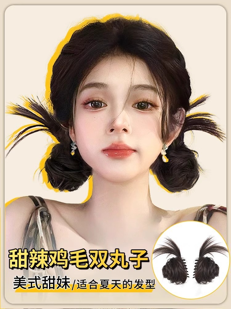 假发女辣妹鸡毛抓夹双丸子一体式发包鸡毛毽子仿真发假发发包头饰