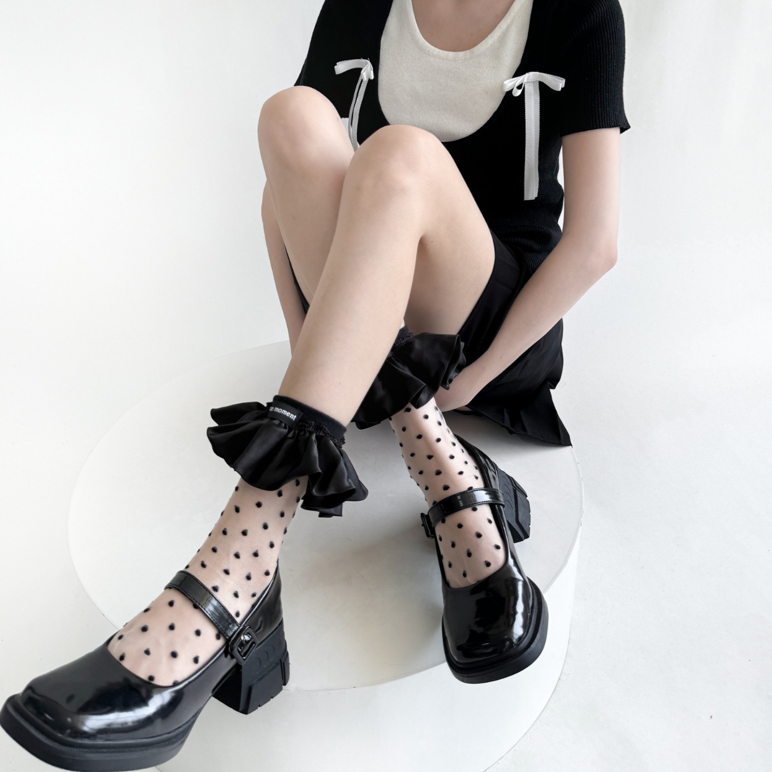 夏季日系超薄透肉波点卡丝丝袜甜美大花边字母布标小众设计中筒袜