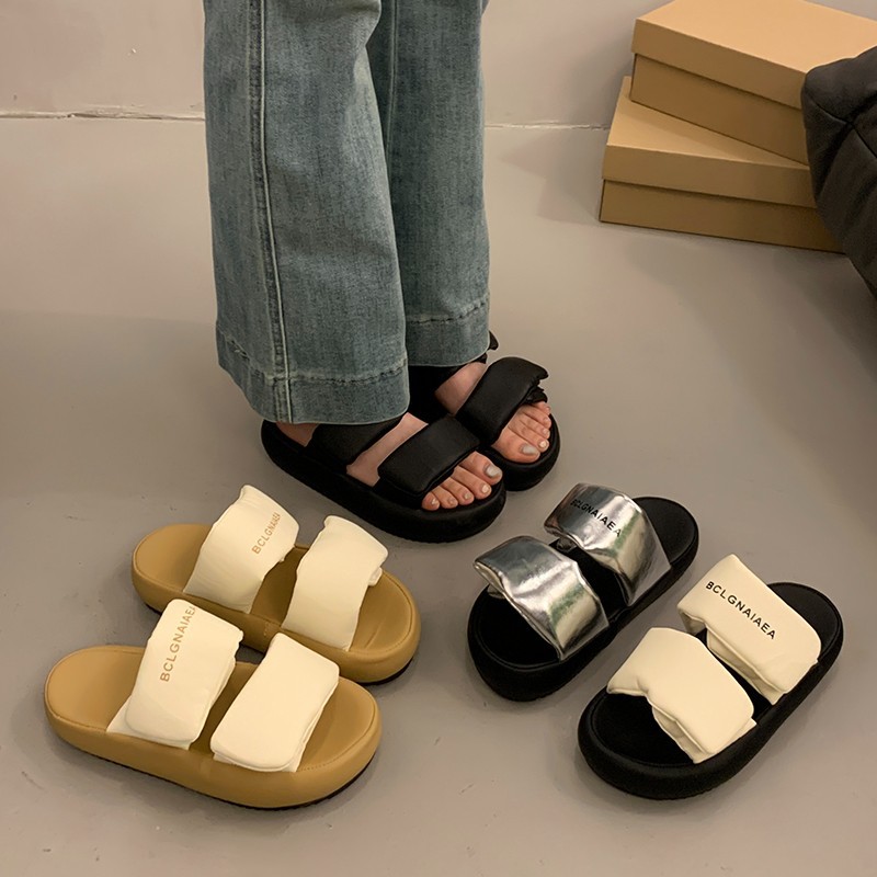 踩屎感厚底拖女外穿夏季百搭一字拖女双带魔术贴软弹面包凉鞋