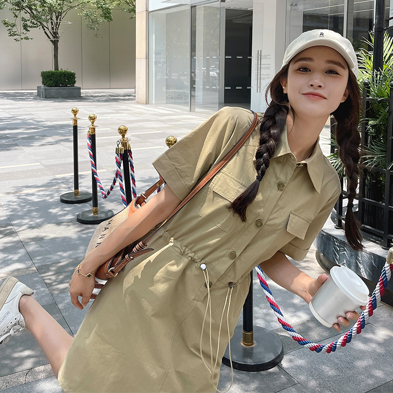 卡其色衬衫领连衣裙夏装新款小个子时尚工装衬衫式纯棉连衣裙