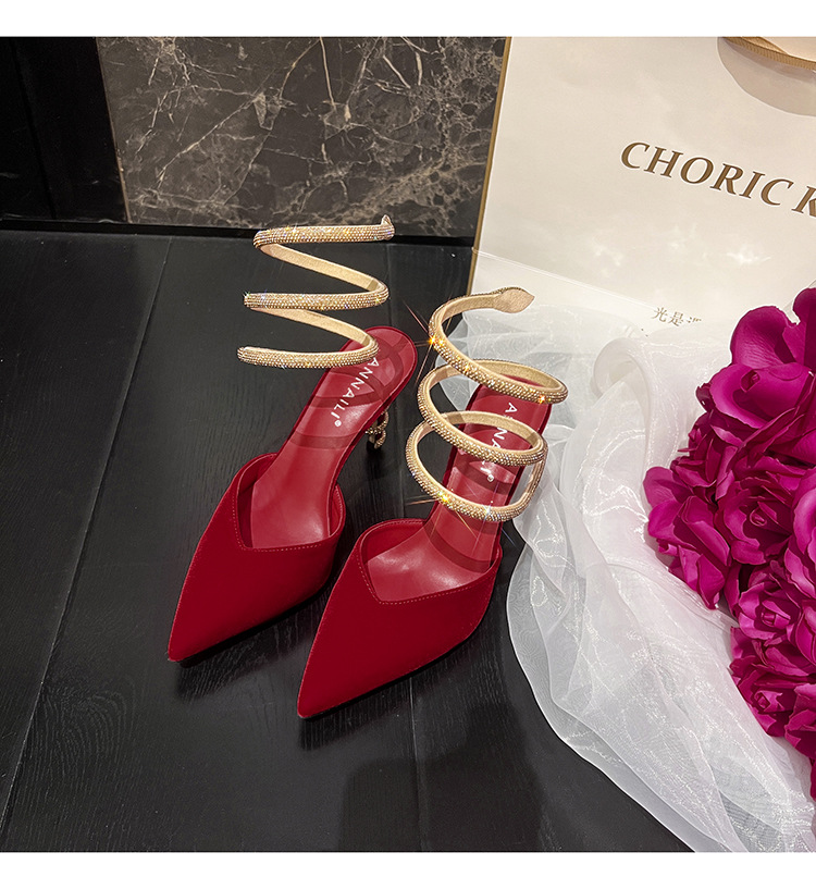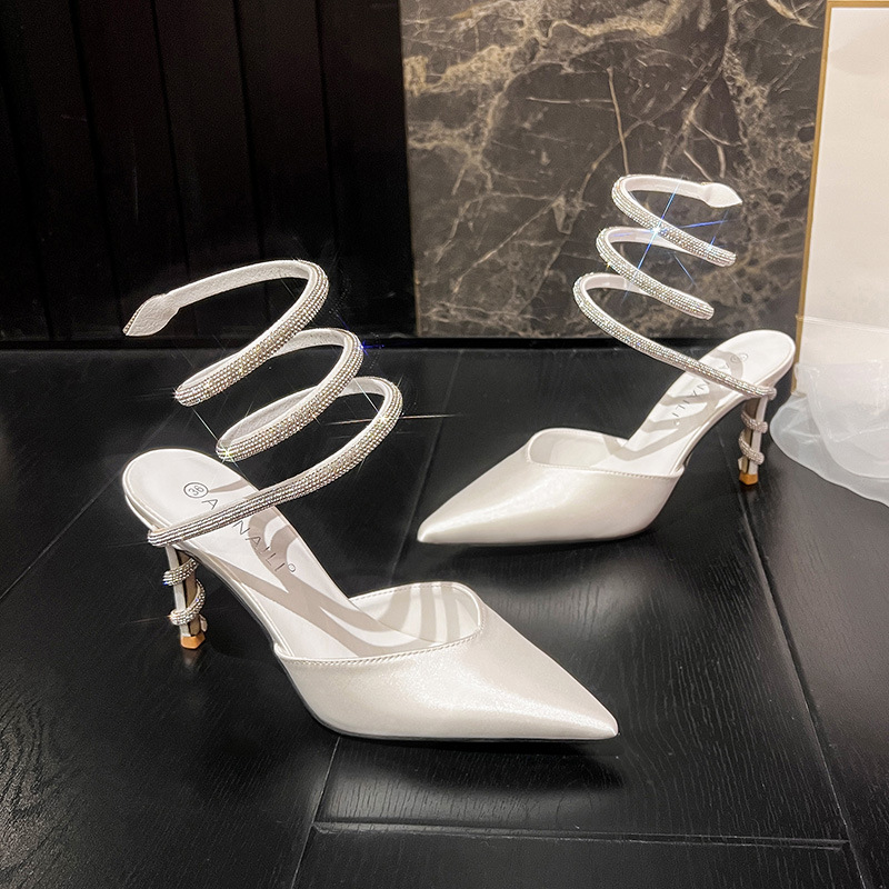 包头凉鞋女夏欧美性感蛇形缠绕水钻绒面尖头高跟鞋白色缎面婚礼鞋