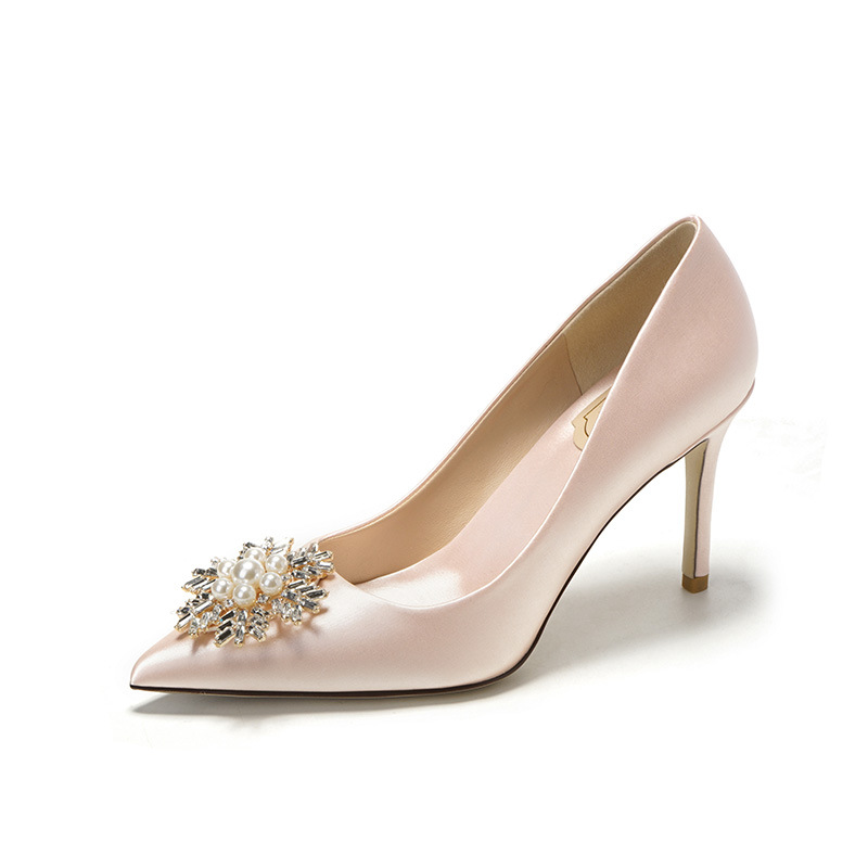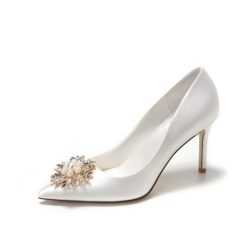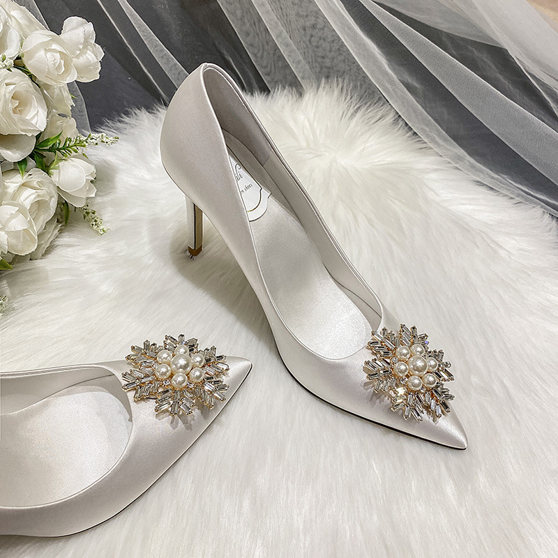 法式主婚纱婚鞋雪花珍珠扣白色高跟鞋缎面伴娘礼服单鞋大码新娘鞋
