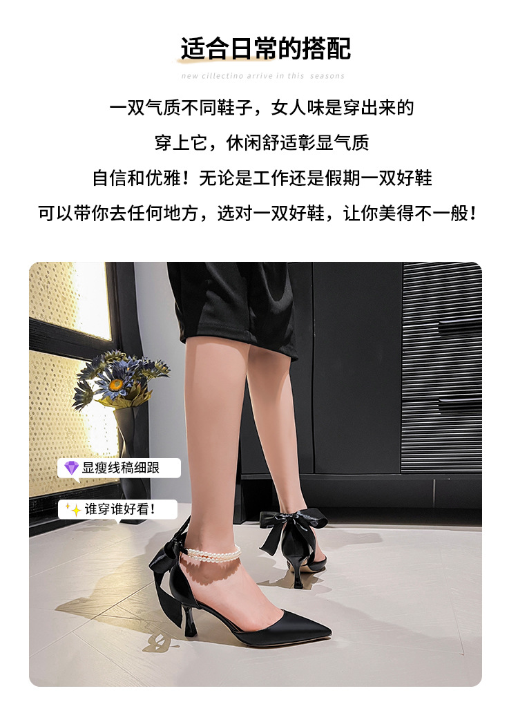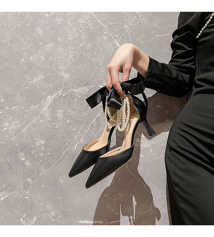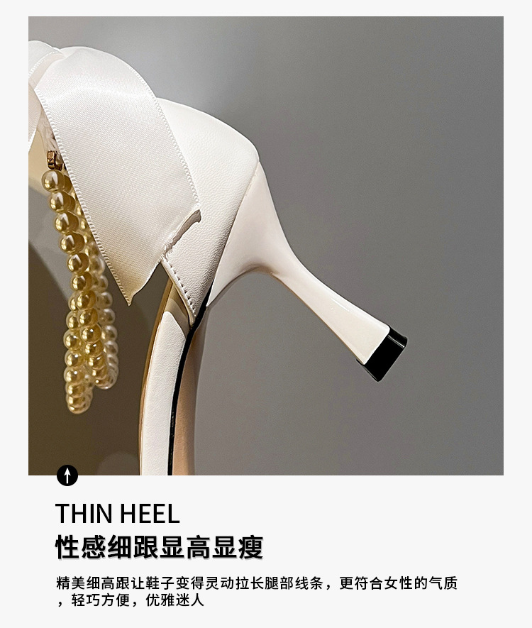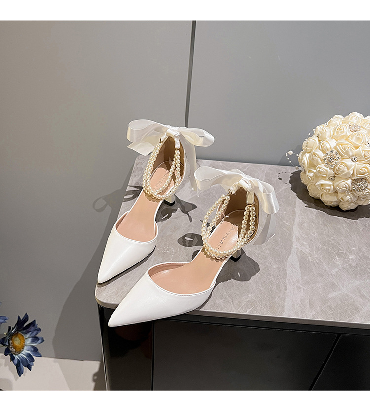 外贸法式优雅高跟鞋女尖头中空珍珠链蝴蝶结白色婚鞋粗跟大码单鞋