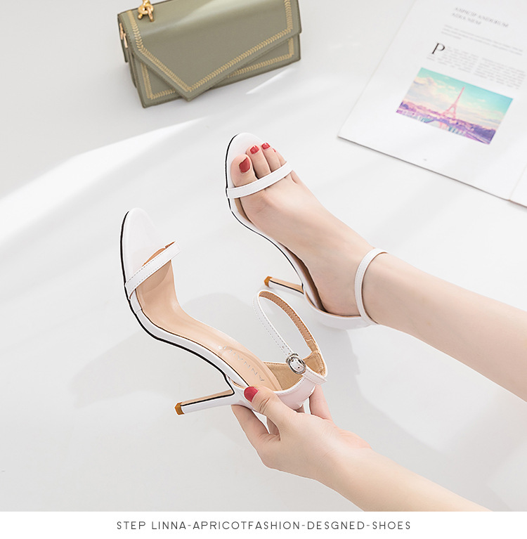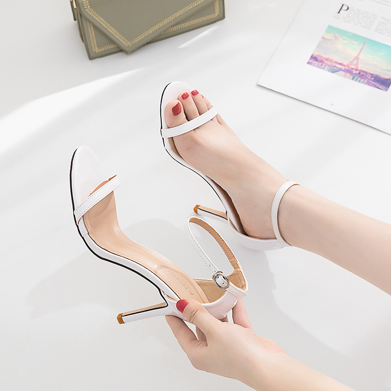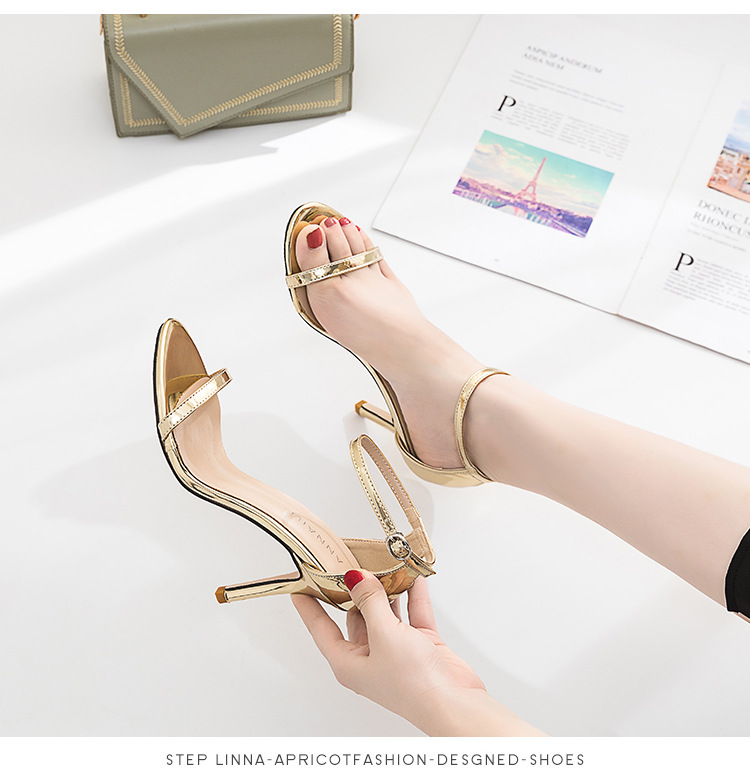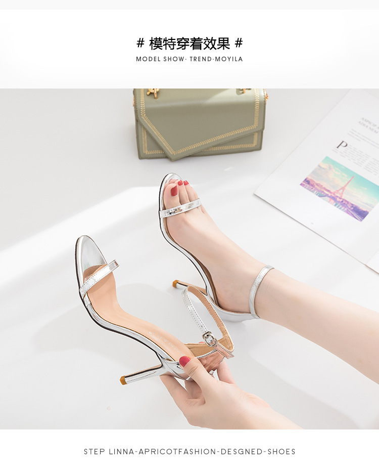 新款银色高跟鞋凉鞋女夏一字带扣细跟露趾性感香槟金细带女鞋