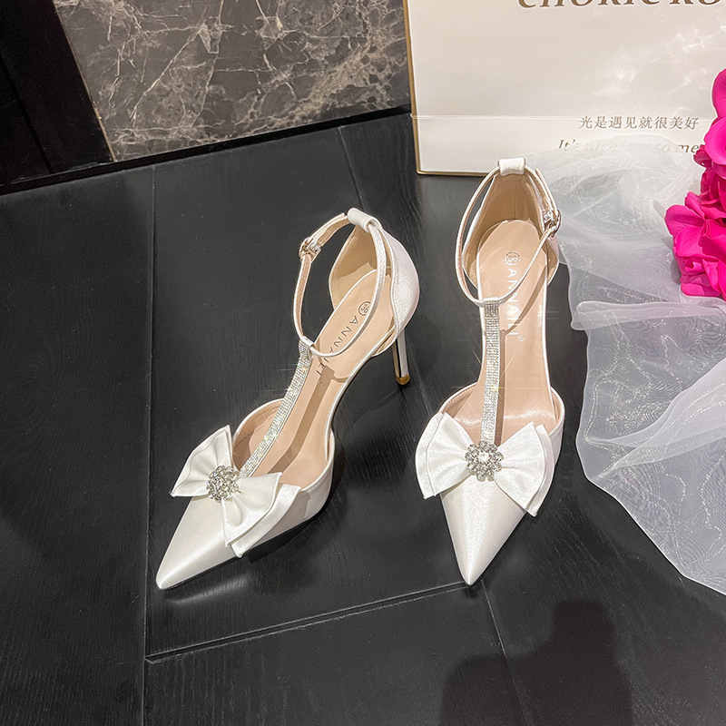 春秋新款水钻蝴蝶结尖头中空高跟鞋一字带包头凉鞋缎面白色婚礼鞋