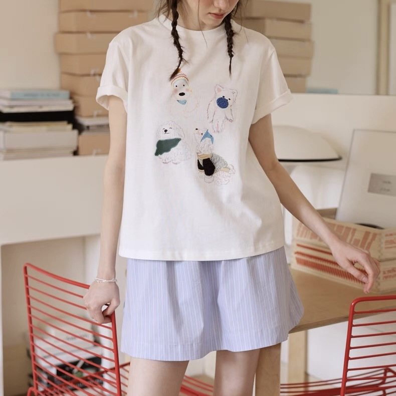 四只小狗' 立体植绒卡通手绘印花松弛亲肤短袖T恤