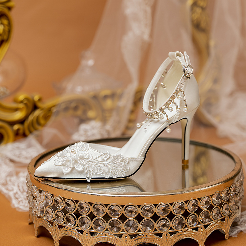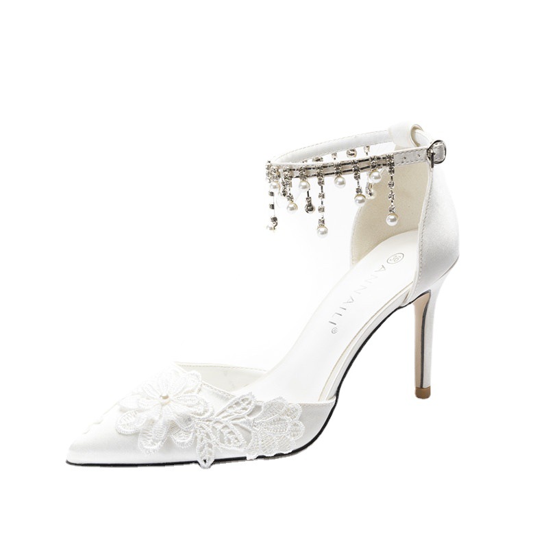 法式婚鞋珍珠流苏链主婚纱蕾丝花朵白色高跟新娘鞋一字带中空单鞋