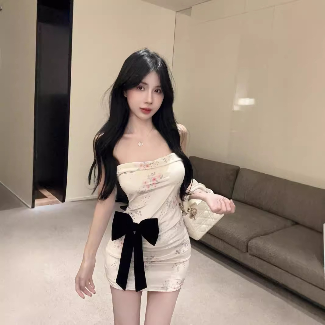 辣妹显瘦修身性感纯欲立体装饰蝴蝶结抹胸包臀复古裹胸礼服连衣裙