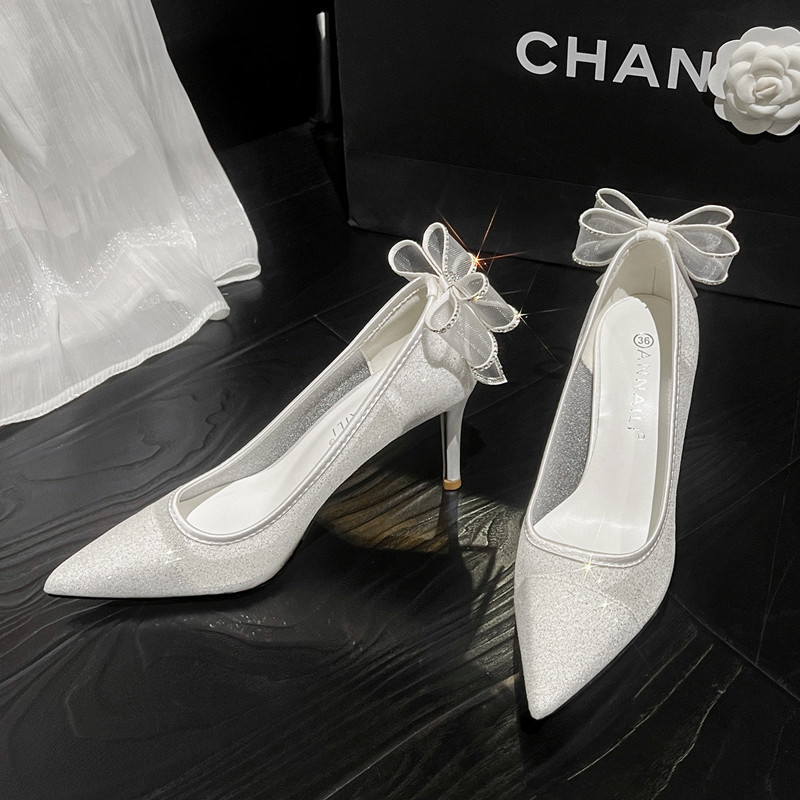 婚鞋女新款网纱白色高跟鞋细跟婚纱新娘鞋蝴蝶结成人礼服鞋