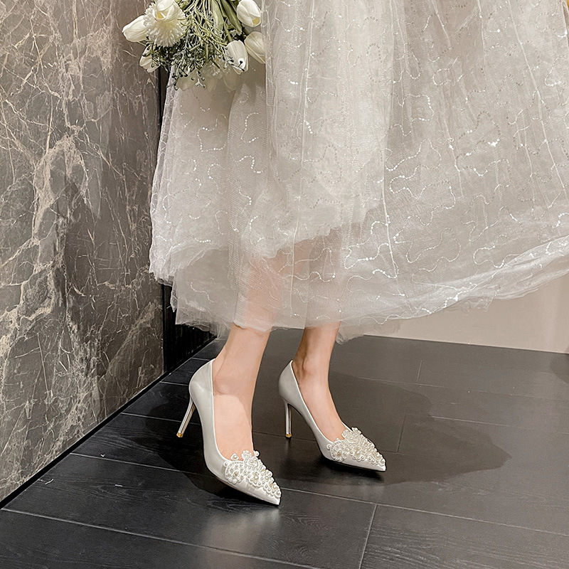 白色婚鞋新娘鞋法式尖头主婚纱单鞋水钻珍珠礼服宴会大码高跟鞋