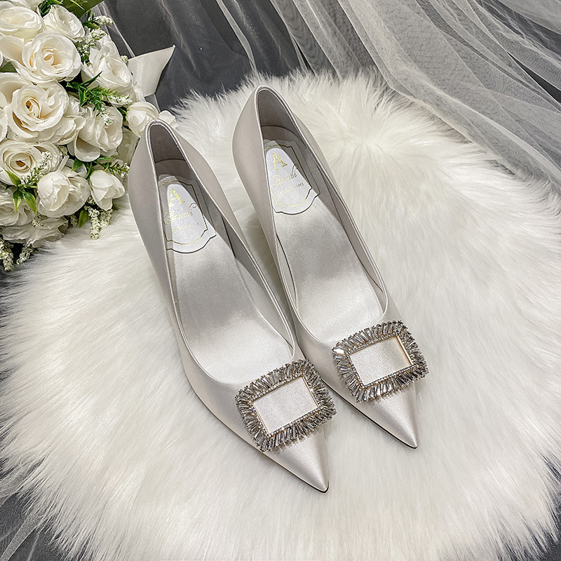 婚纱白色缎面结婚新娘鞋水钻方扣法式礼服香槟色水钻方扣高跟鞋女