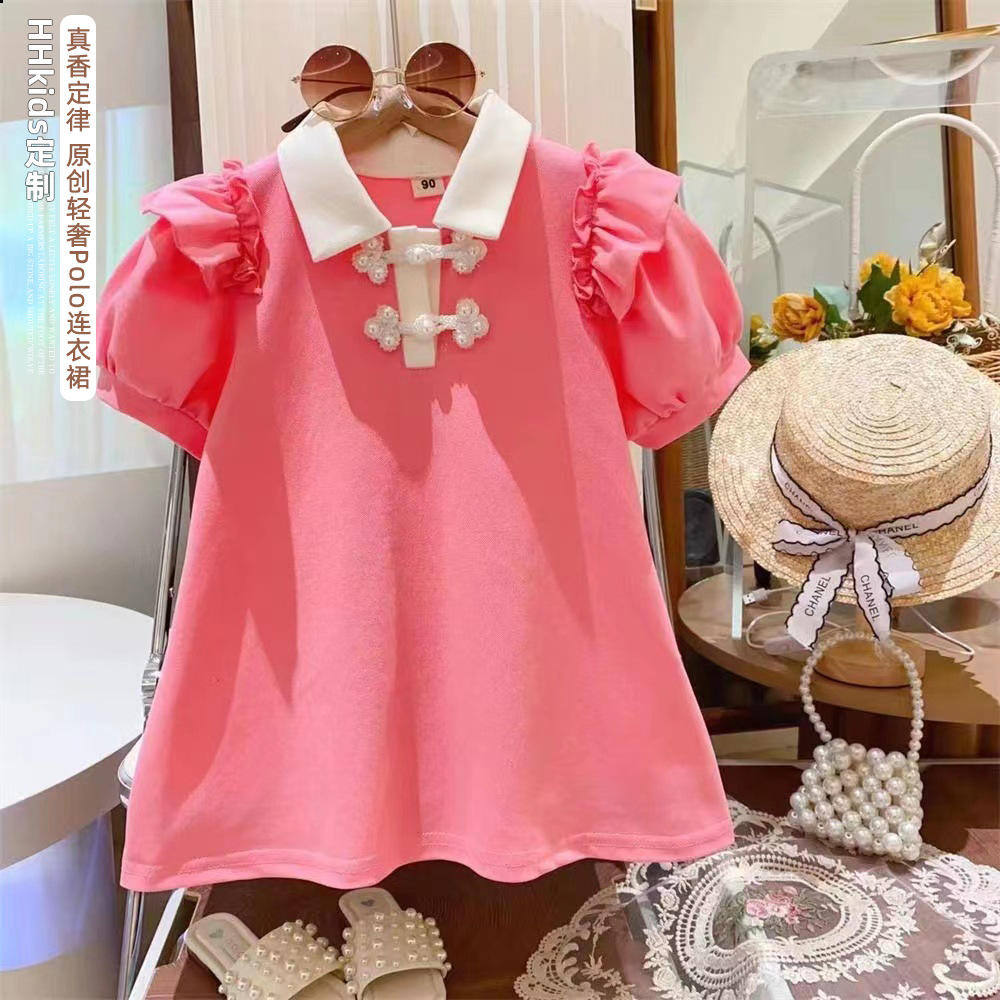 新品女童Polo领花边泡泡短袖洋气公主粉连衣裙2025夏装