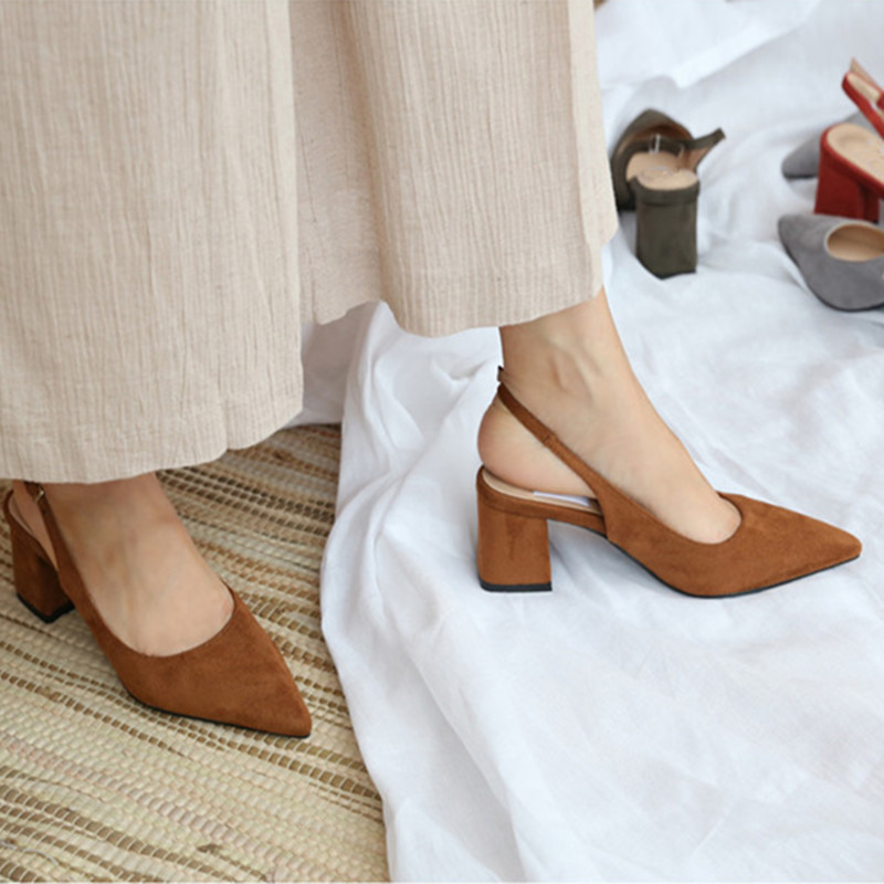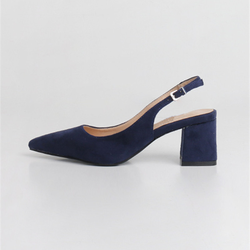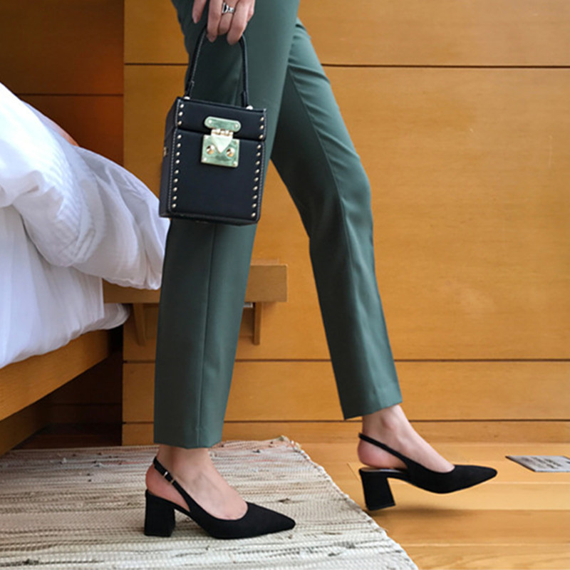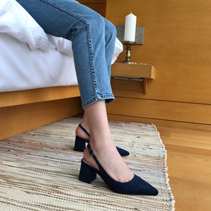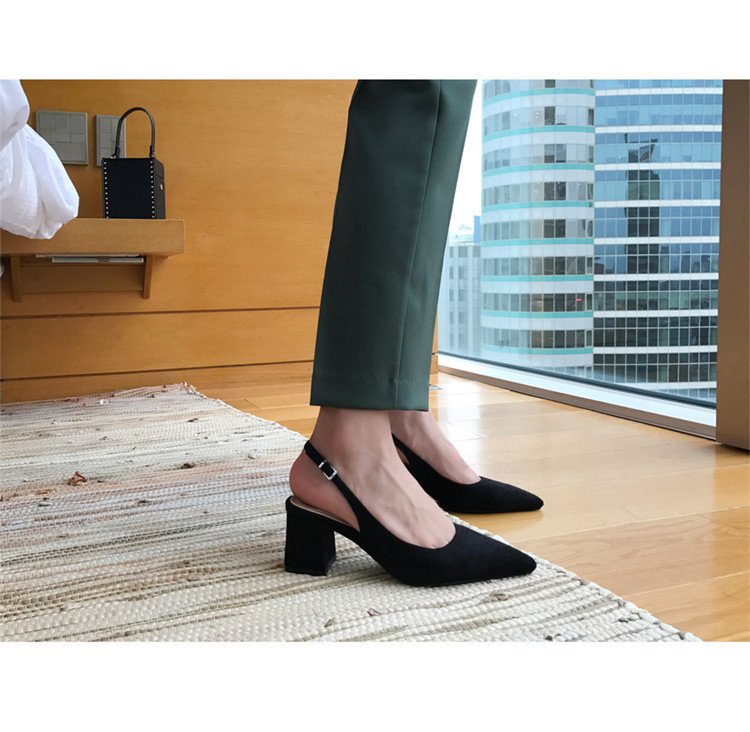 韩版新款一字扣带包头后空高跟鞋尖头粗跟女单鞋小码31 32 33