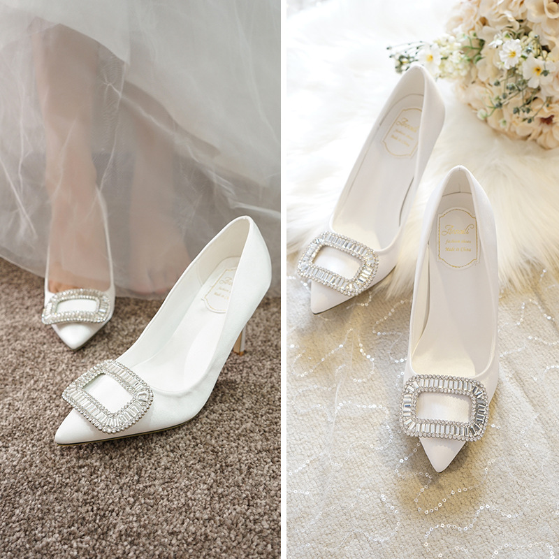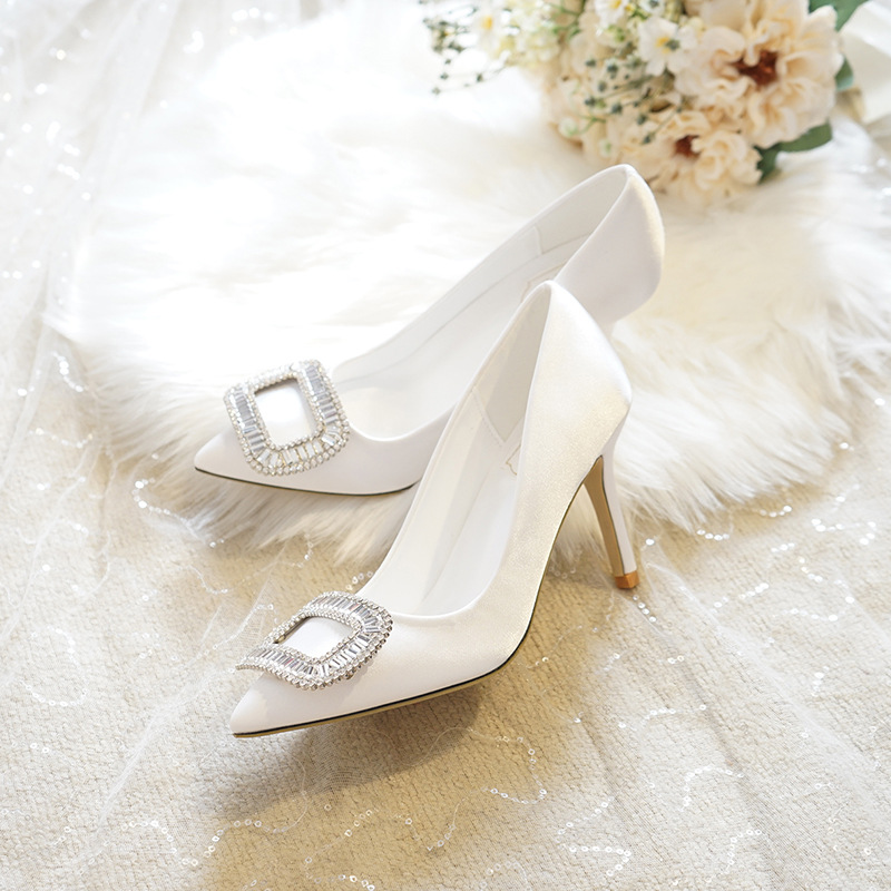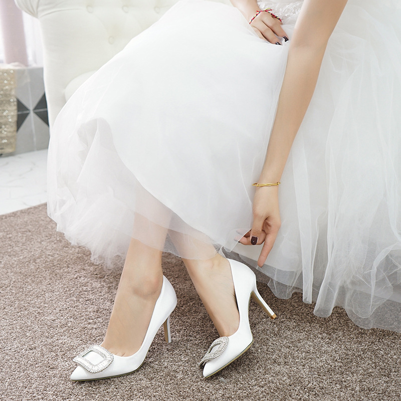 新款尖头水钻礼服宴会鞋婚纱新娘白色高跟鞋女细跟小码女鞋