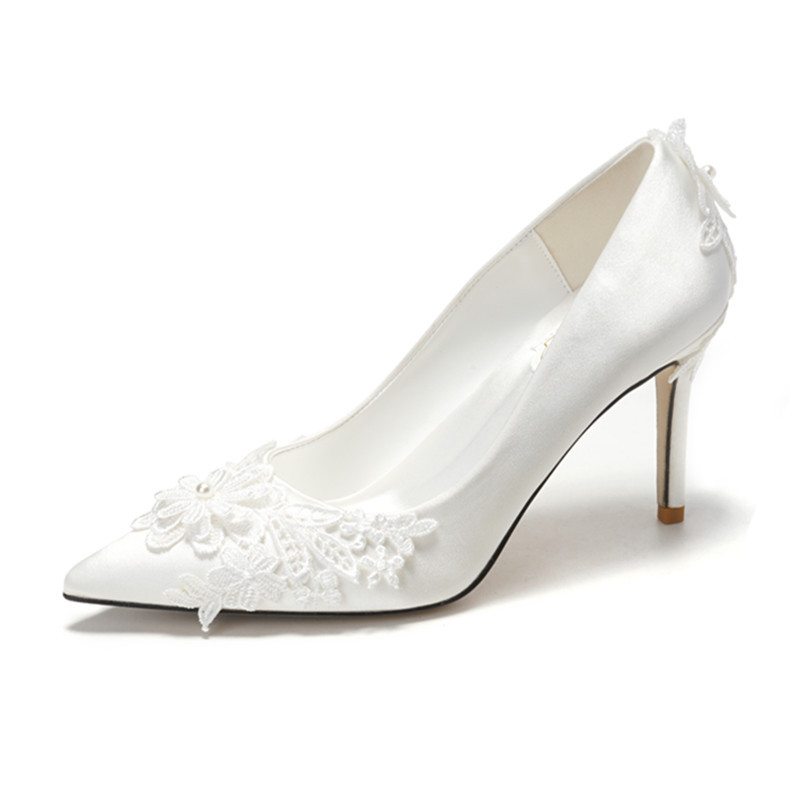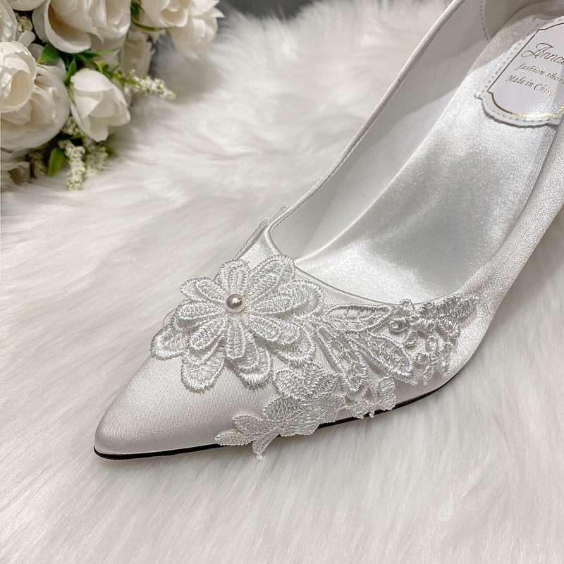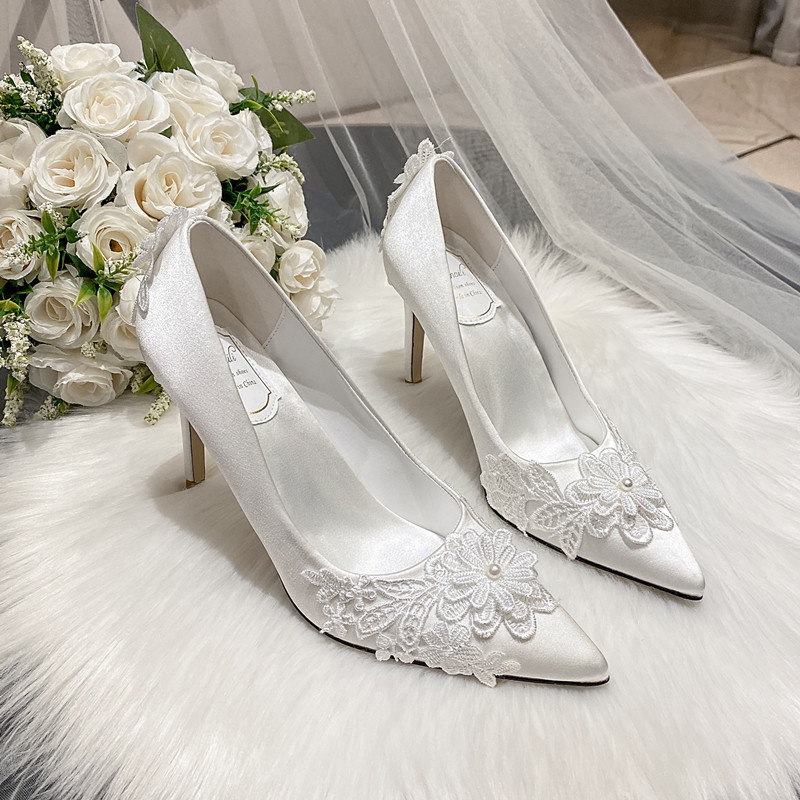 新款白色高跟鞋结婚蕾丝婚纱鞋绸缎大码香槟色礼服伴娘鞋