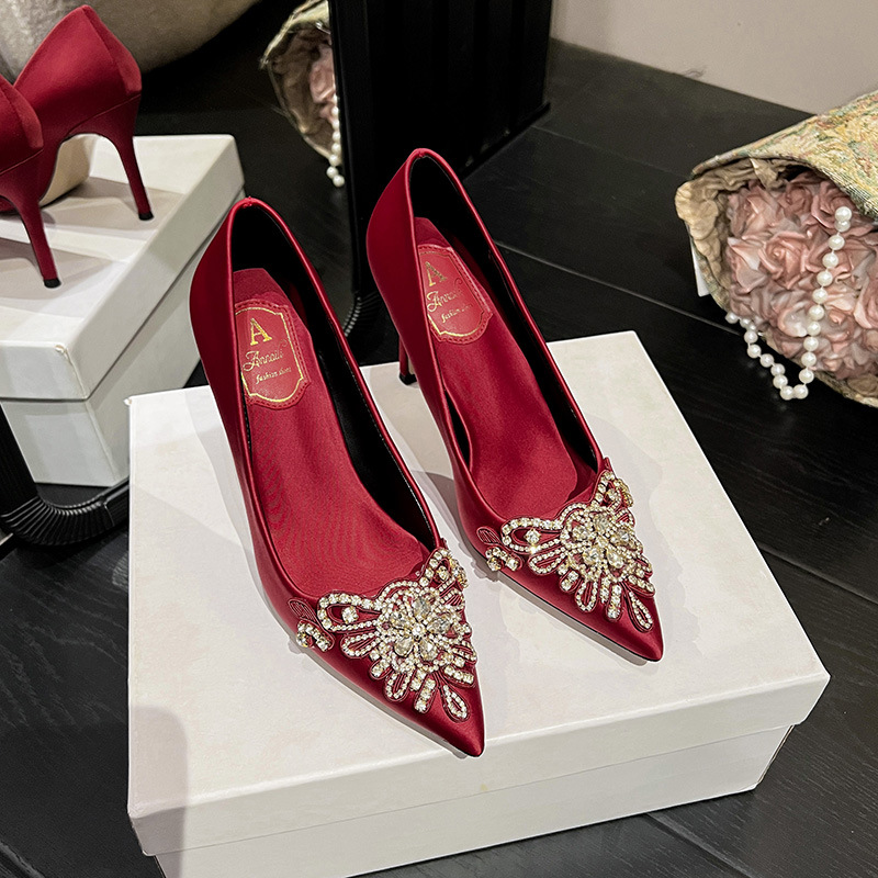 香槟色婚鞋酒红色秀禾婚纱两穿新娘高跟鞋宴会礼服中式刺绣旗袍鞋