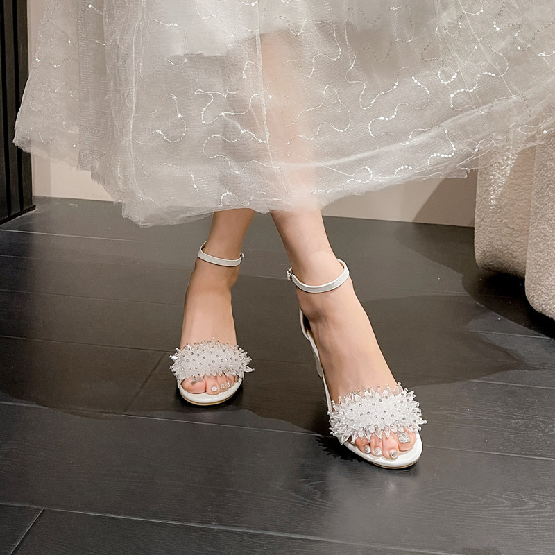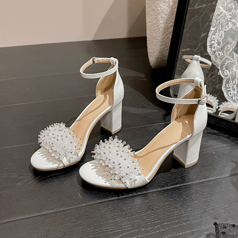 新款水钻高跟一字带方跟白色新娘婚礼鞋大码42 43粗跟女凉鞋