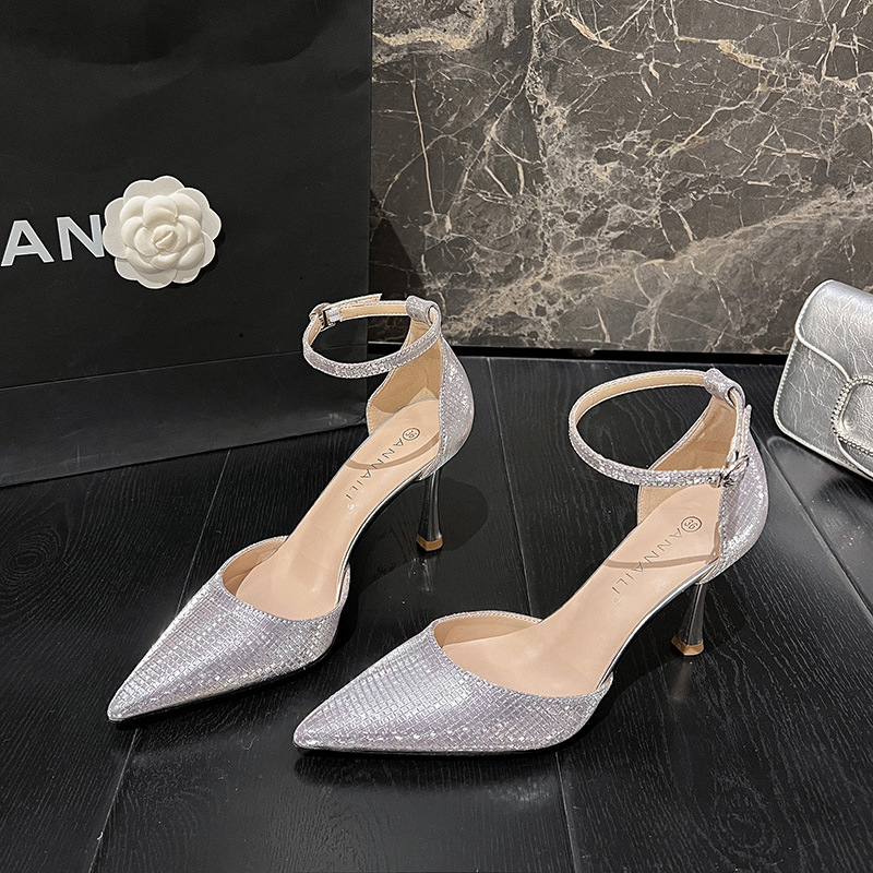 新款银色亮片中空包头凉鞋一字带女法式尖头细跟宴会礼服单鞋