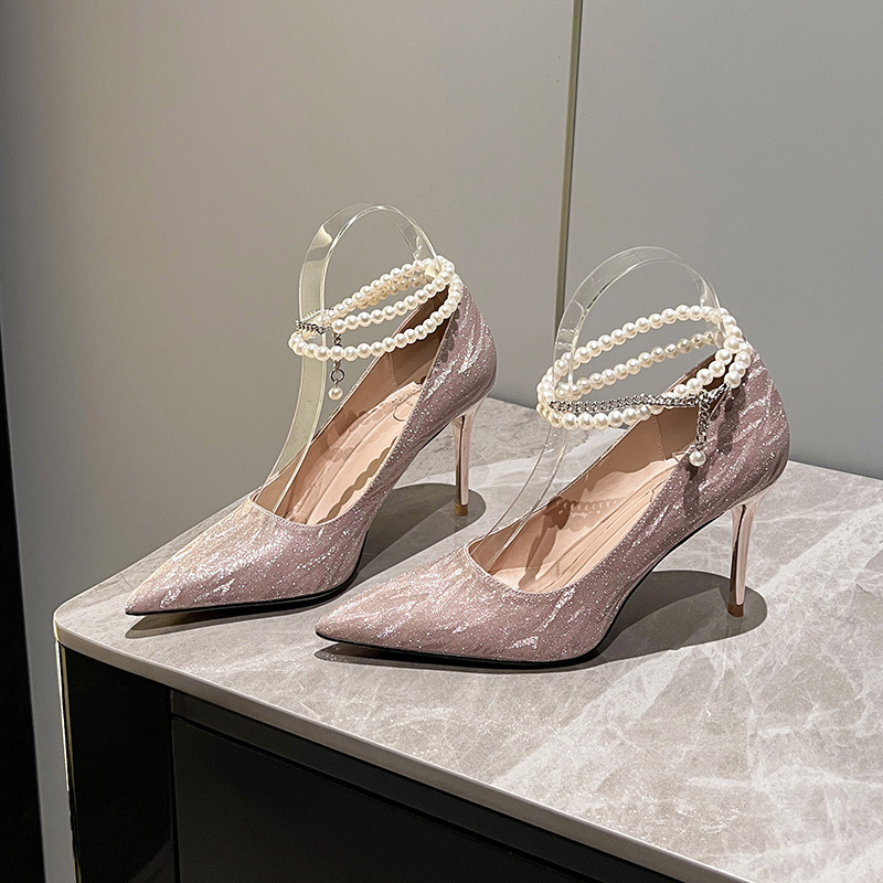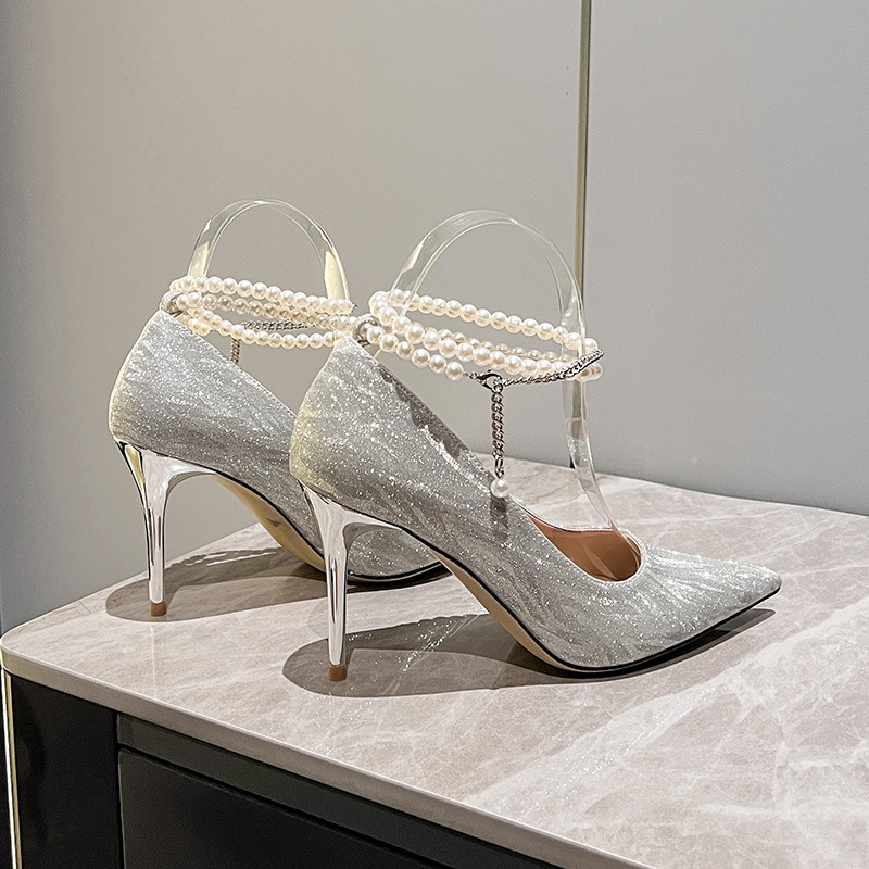 成人礼一字带珍珠链亮片单鞋大码尖头细跟银色礼服婚纱伴娘高跟鞋