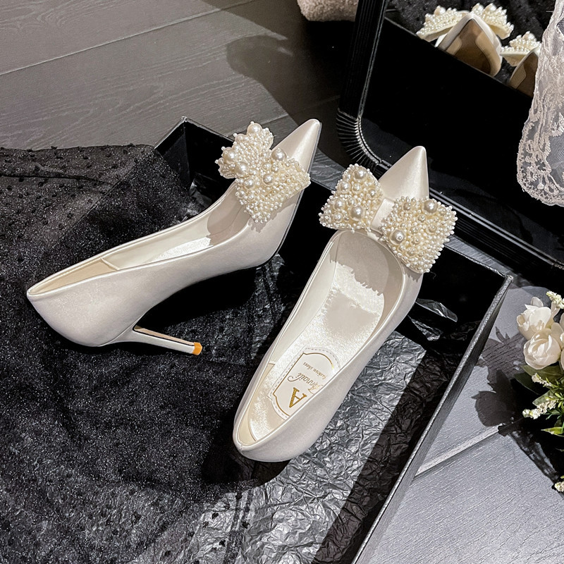 蝴蝶结高跟鞋女新款白色婚礼鞋小众伴娘礼服宴会大码尖头单鞋