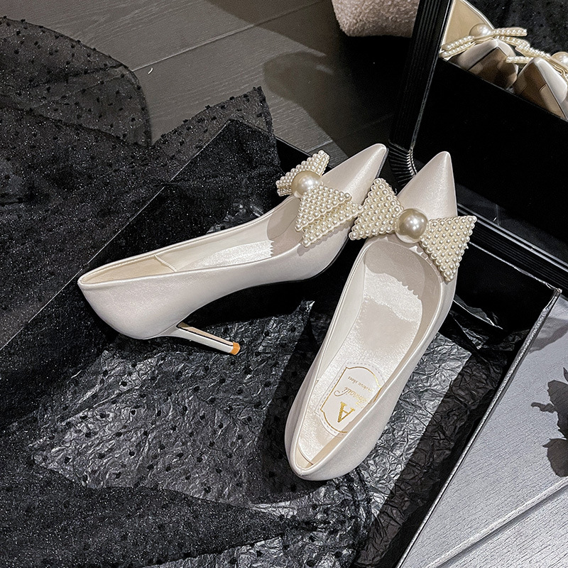 法式婚鞋女新款白色新娘鞋主婚纱高跟鞋大码蝴蝶结礼服鞋