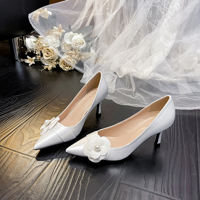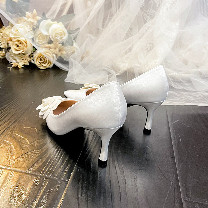 白色主纱婚鞋女新款缎面山茶花法式礼服宴会高跟鞋大码女鞋