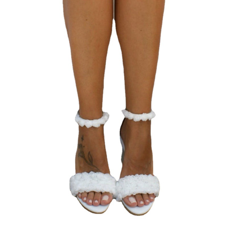 蕾丝花朵一字带粗跟凉鞋白色婚纱伴娘鞋大码女鞋41-43