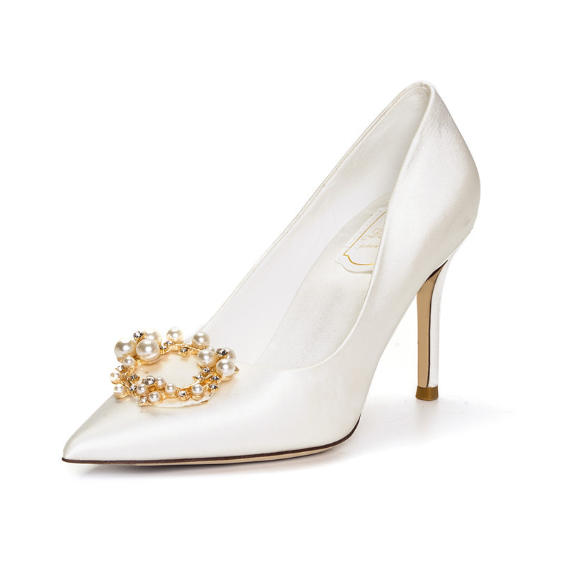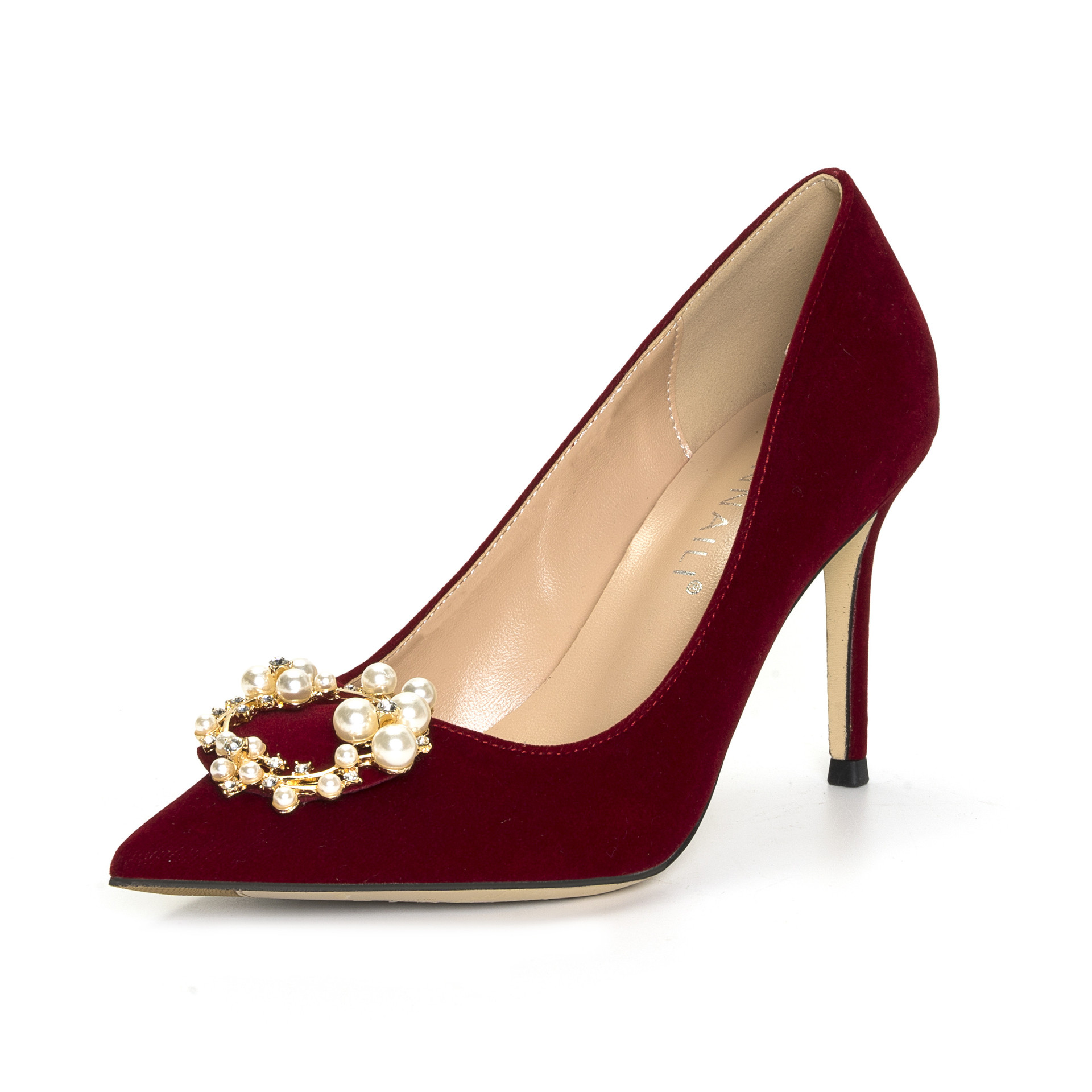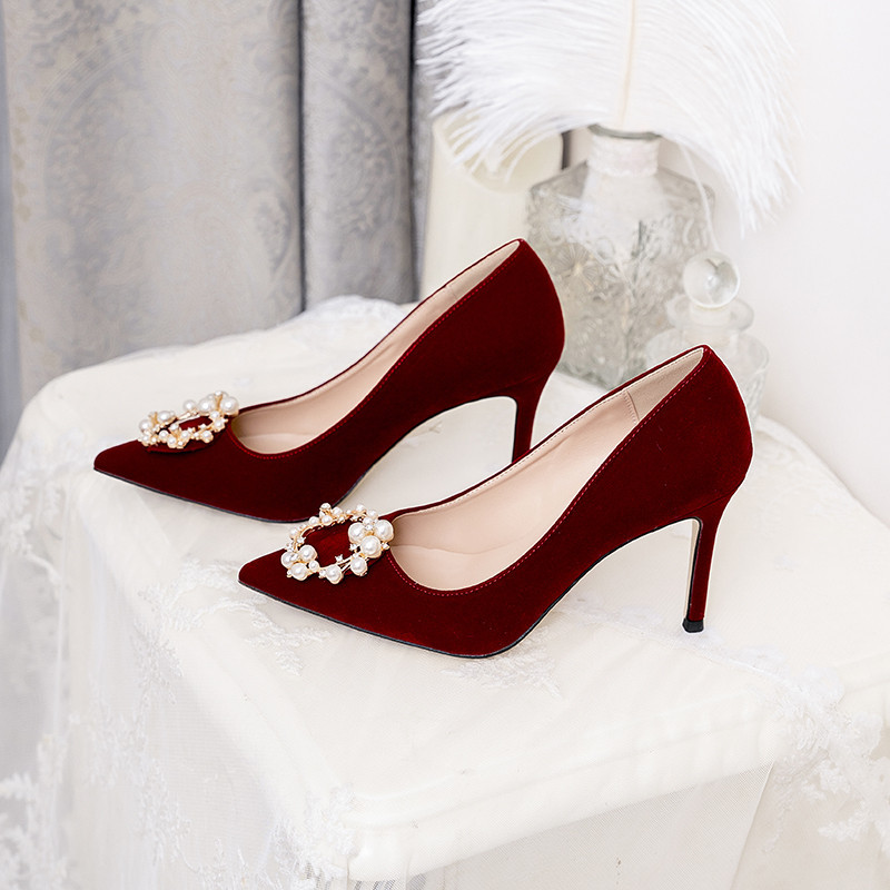 法式主婚鞋秀禾婚纱两穿酒红色新娘鞋珍珠扣白色高跟鞋细跟大码43