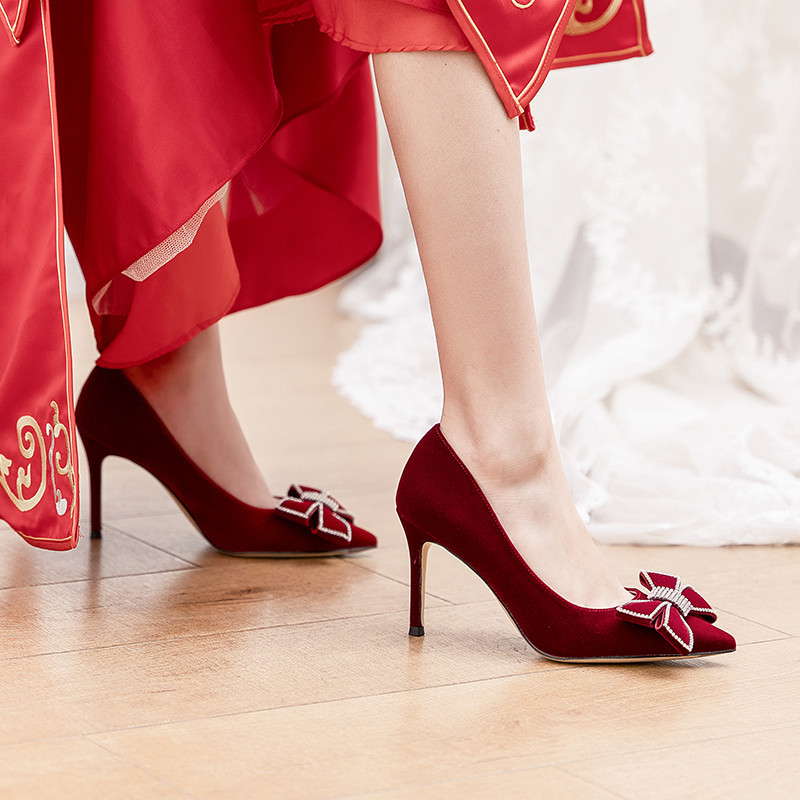 主婚鞋女新款秀禾婚纱两穿酒红色高跟鞋细跟中式礼服宴会单鞋