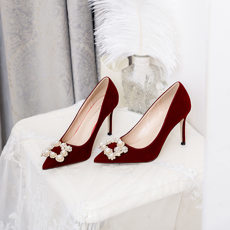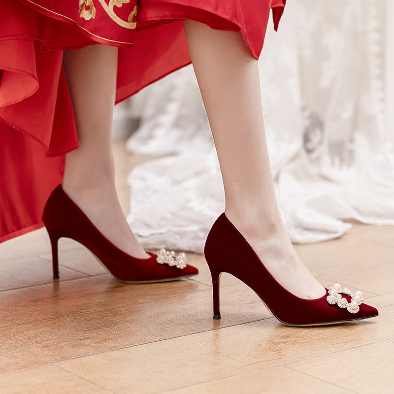 礼服鞋白色高跟鞋女细跟缎面婚纱婚鞋水钻方扣酒红色秀禾新娘鞋