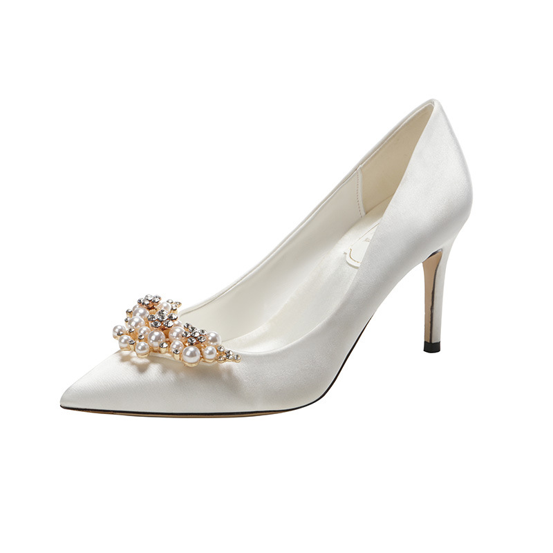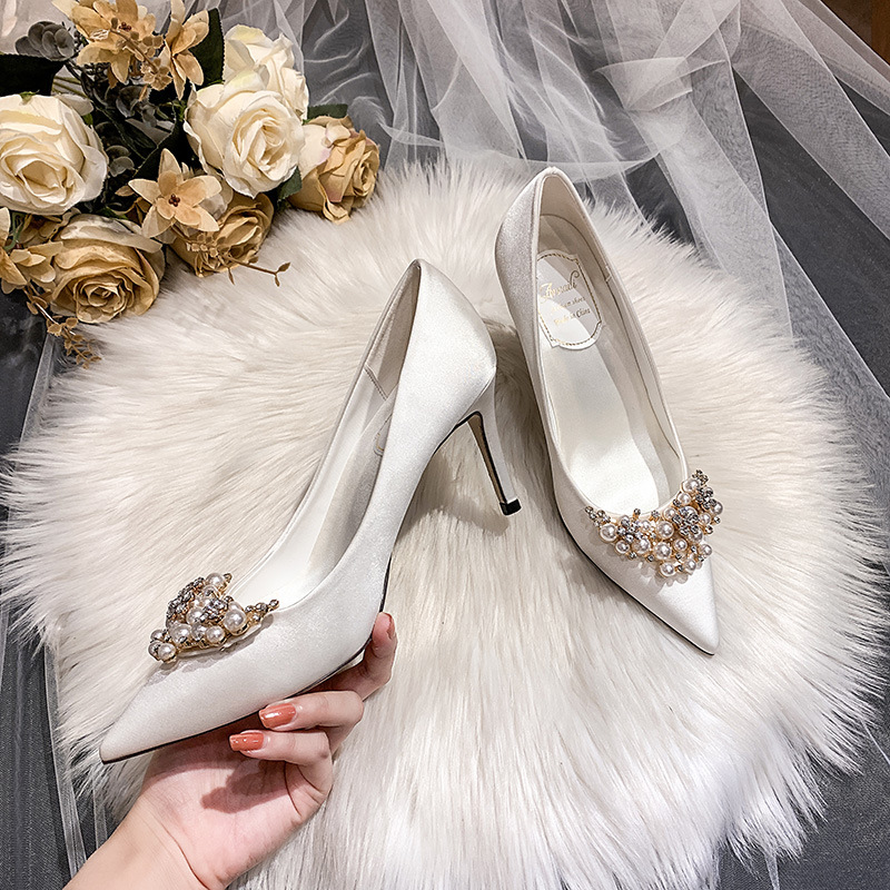 白色婚鞋女新款珍珠扣伴娘礼服婚纱鞋大码42 43细跟浅口单鞋