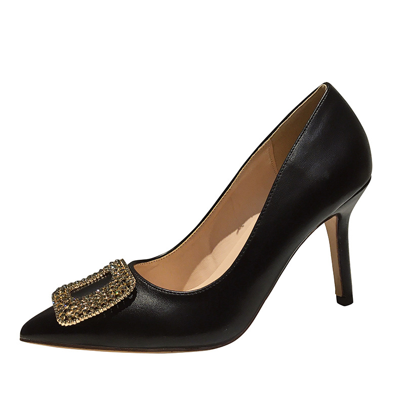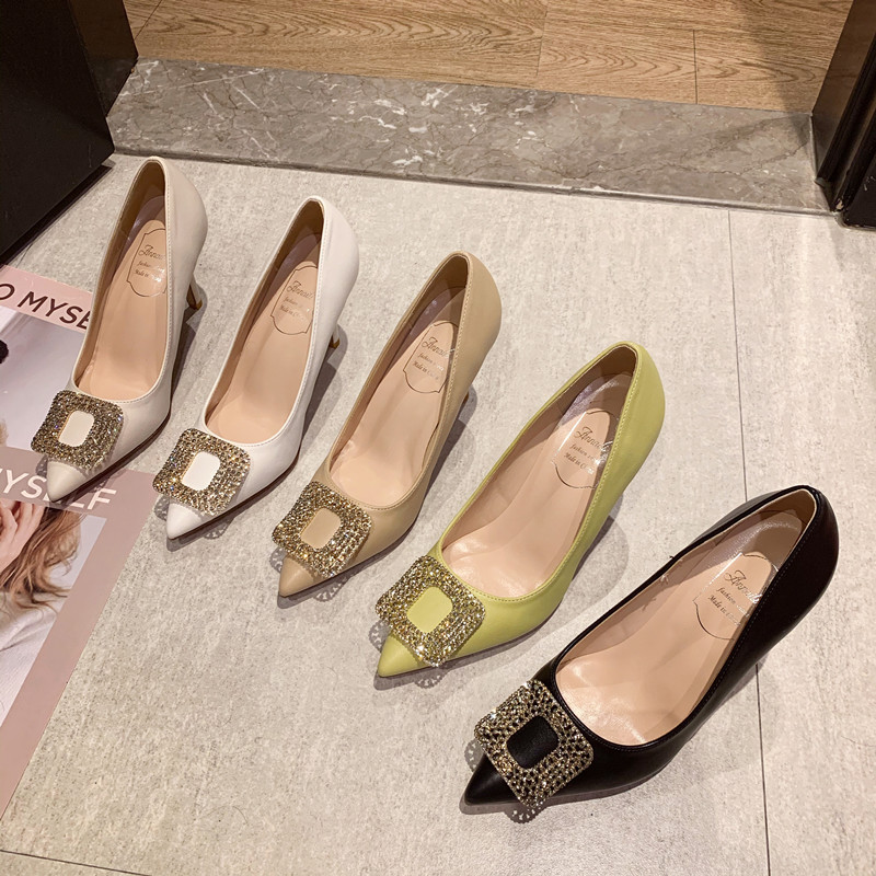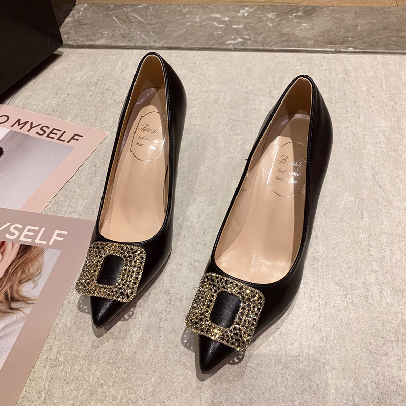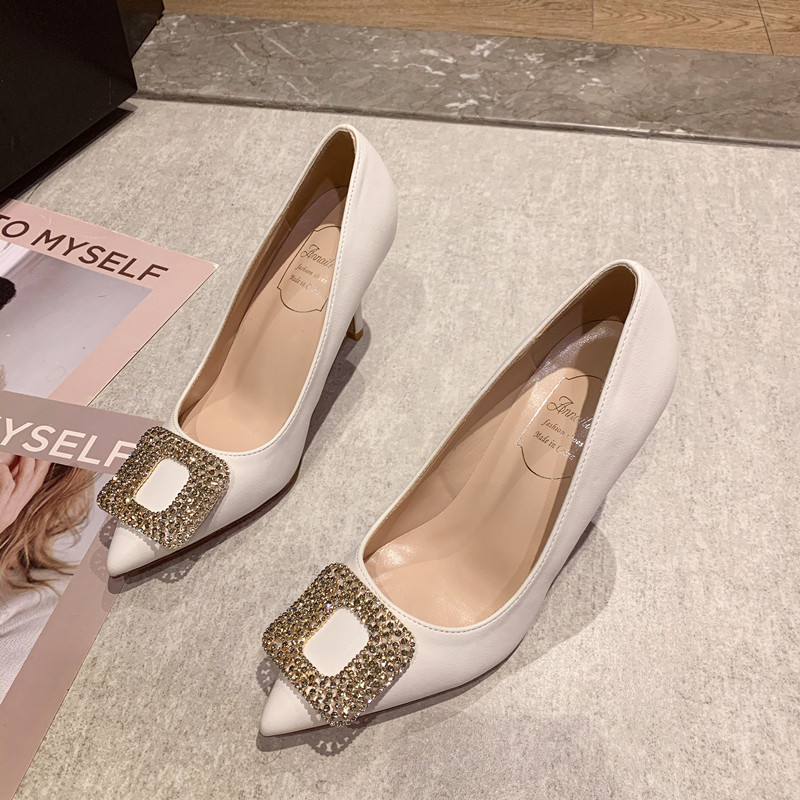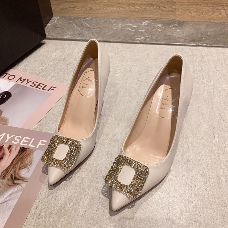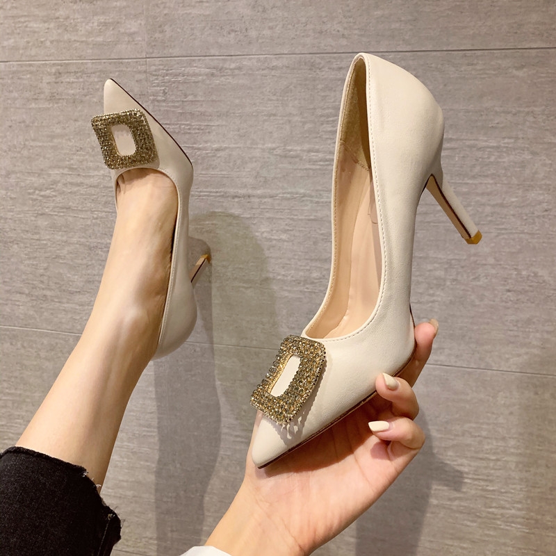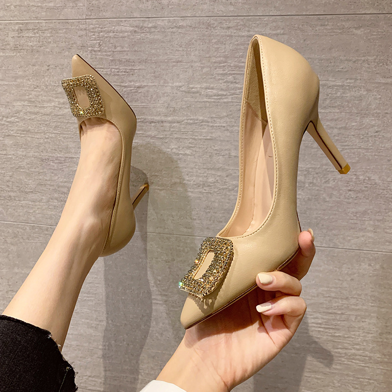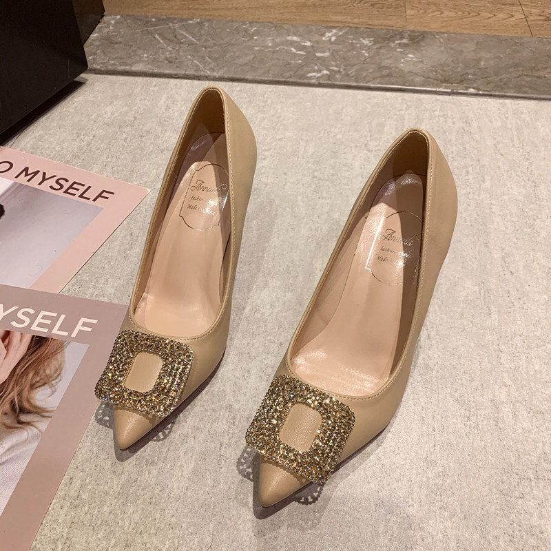 方扣高跟鞋女细跟新款职业水钻杏色尖头单鞋大码42 43