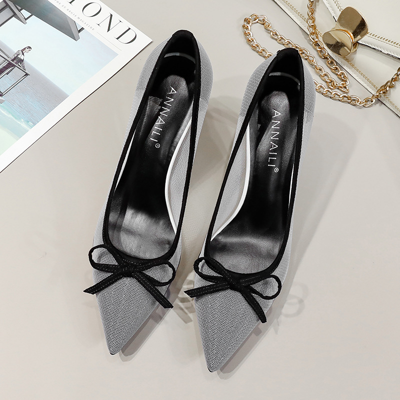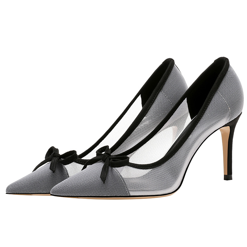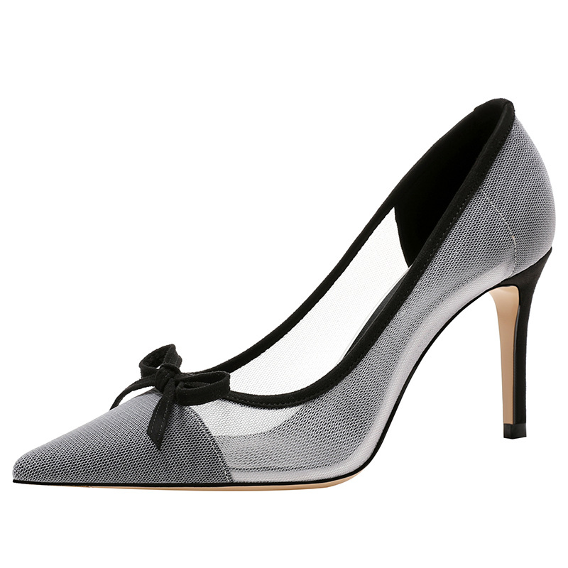 新款网纱蕾丝镂空蝴蝶结尖头高跟鞋女细跟性感透明单鞋