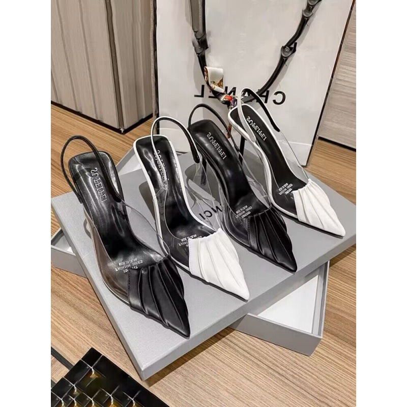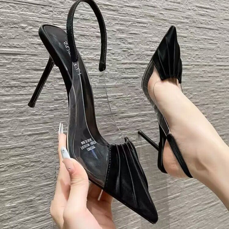 春夏季新款尖头细跟高跟鞋女包头后空褶皱PVC透明凉鞋