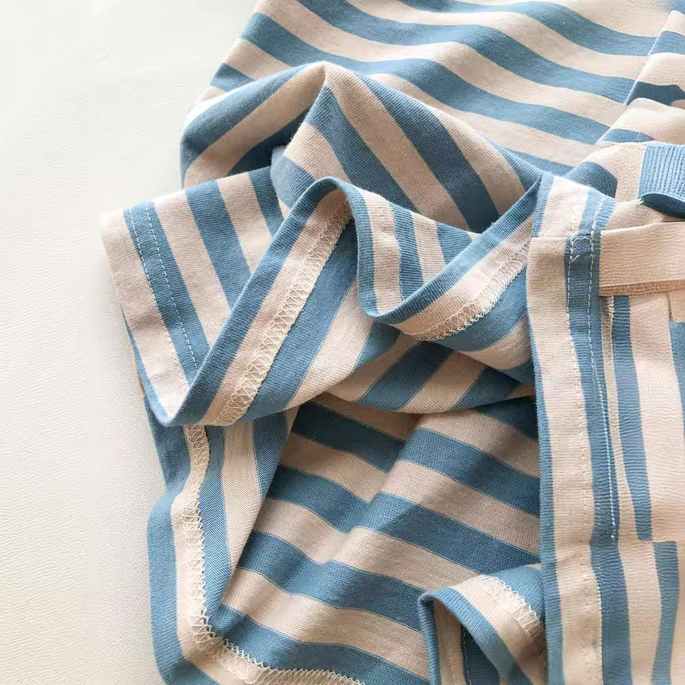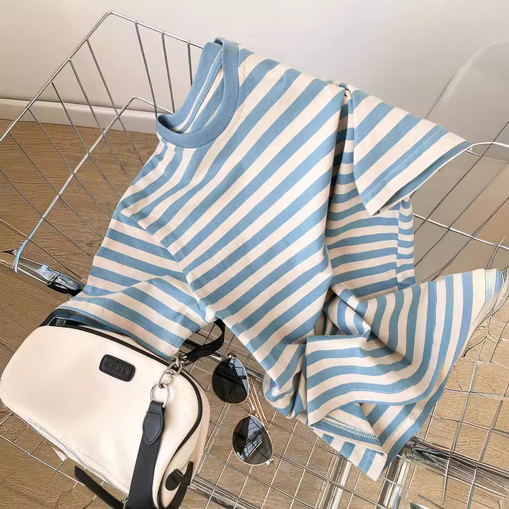 清新蓝撞色条纹短袖t恤女夏季新款圆领宽松半袖显瘦体恤上衣